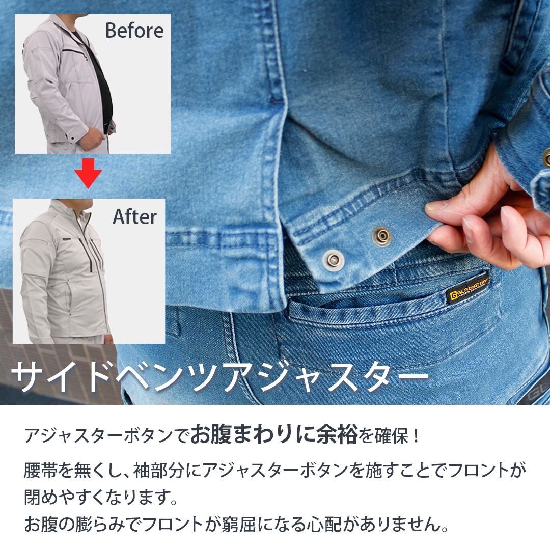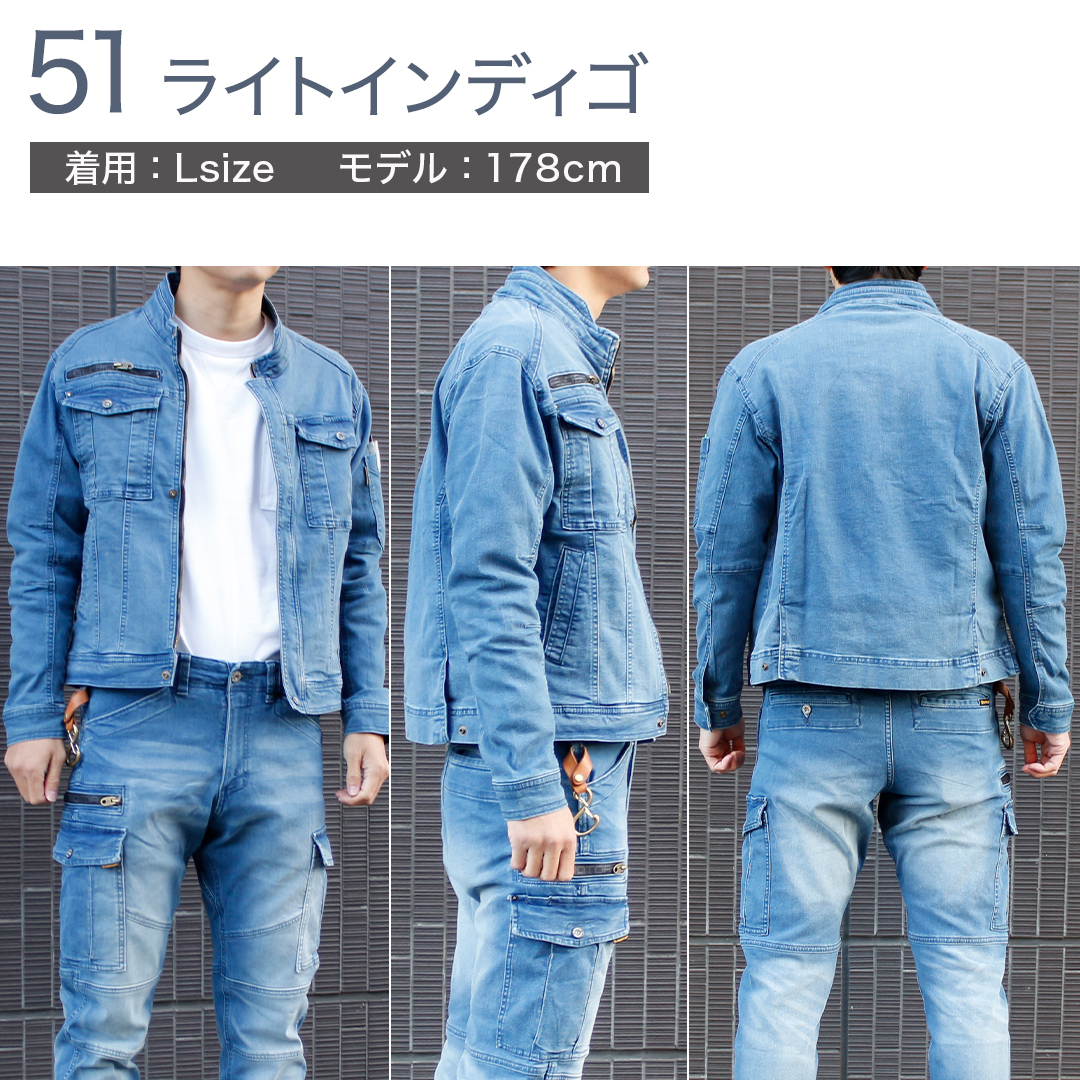 6つのポケットを装備した高い収納力にストレッチ、速乾性などの優れた「機能性」とワイルドでおしゃれな「デザイン性」を兼ね備えたデニムストレッチジャケット。