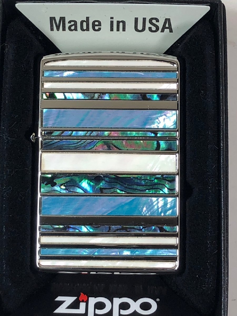 ★Zippo Shell Inlay 天然貝貼り 、 シルバーベース「豪華な貝張り/天然貝象眼」、天然蝶貝インレイ、横ライン・マルチボーダーをイメージしたハンドメイド感溢れる豪華な逸品。複雑な造形のため見る角度によって写りが変わります(貝貼り)、裏面は無地のシルバー色。