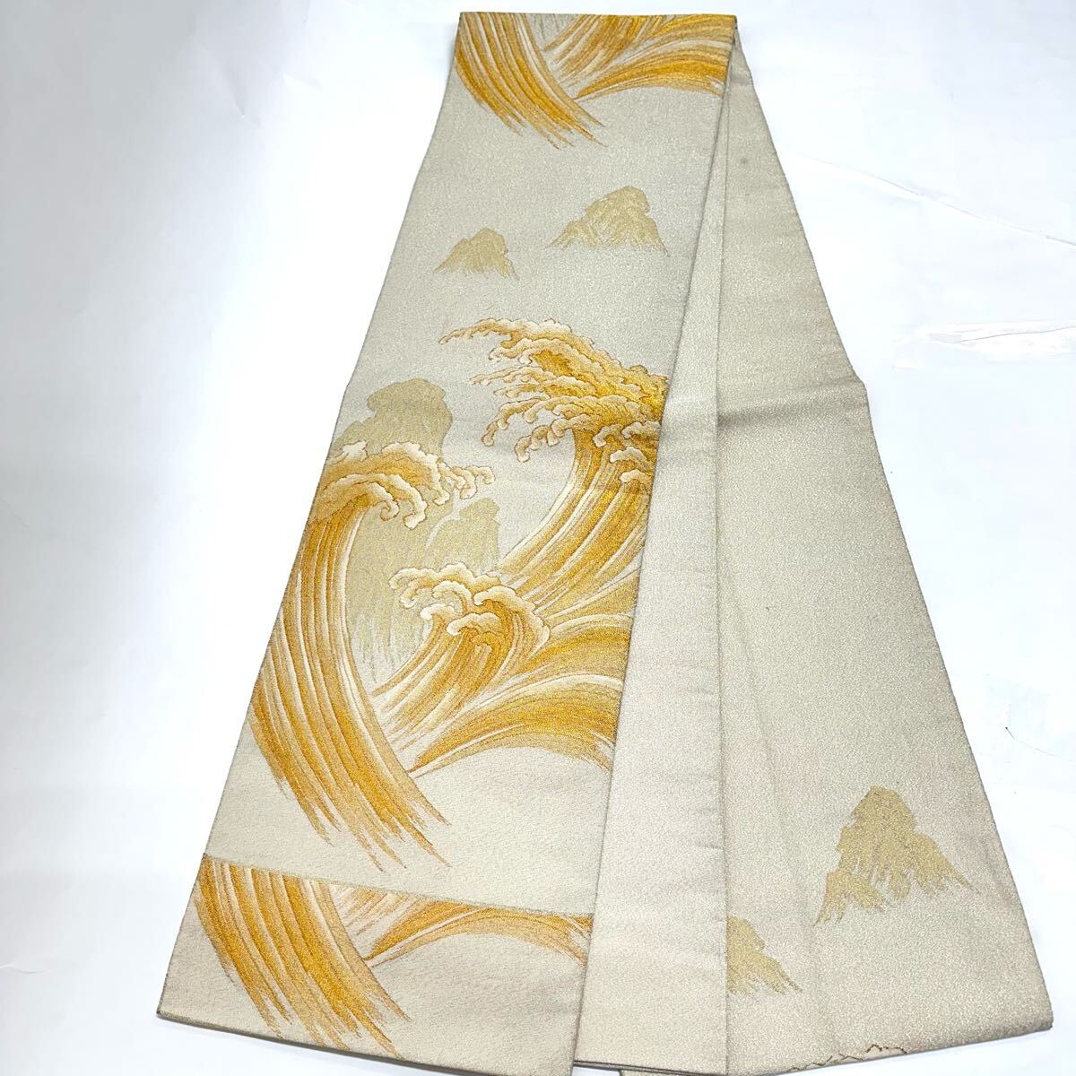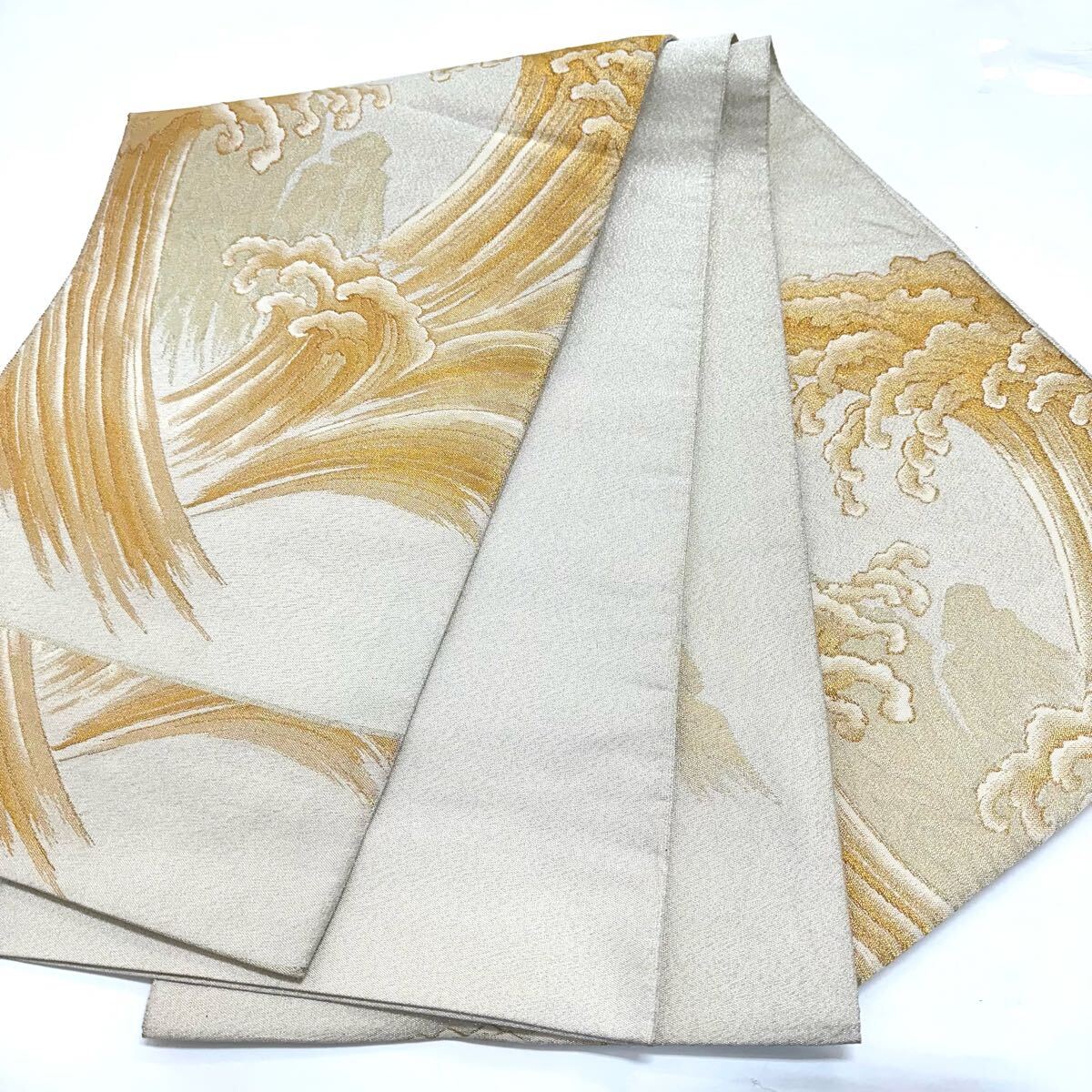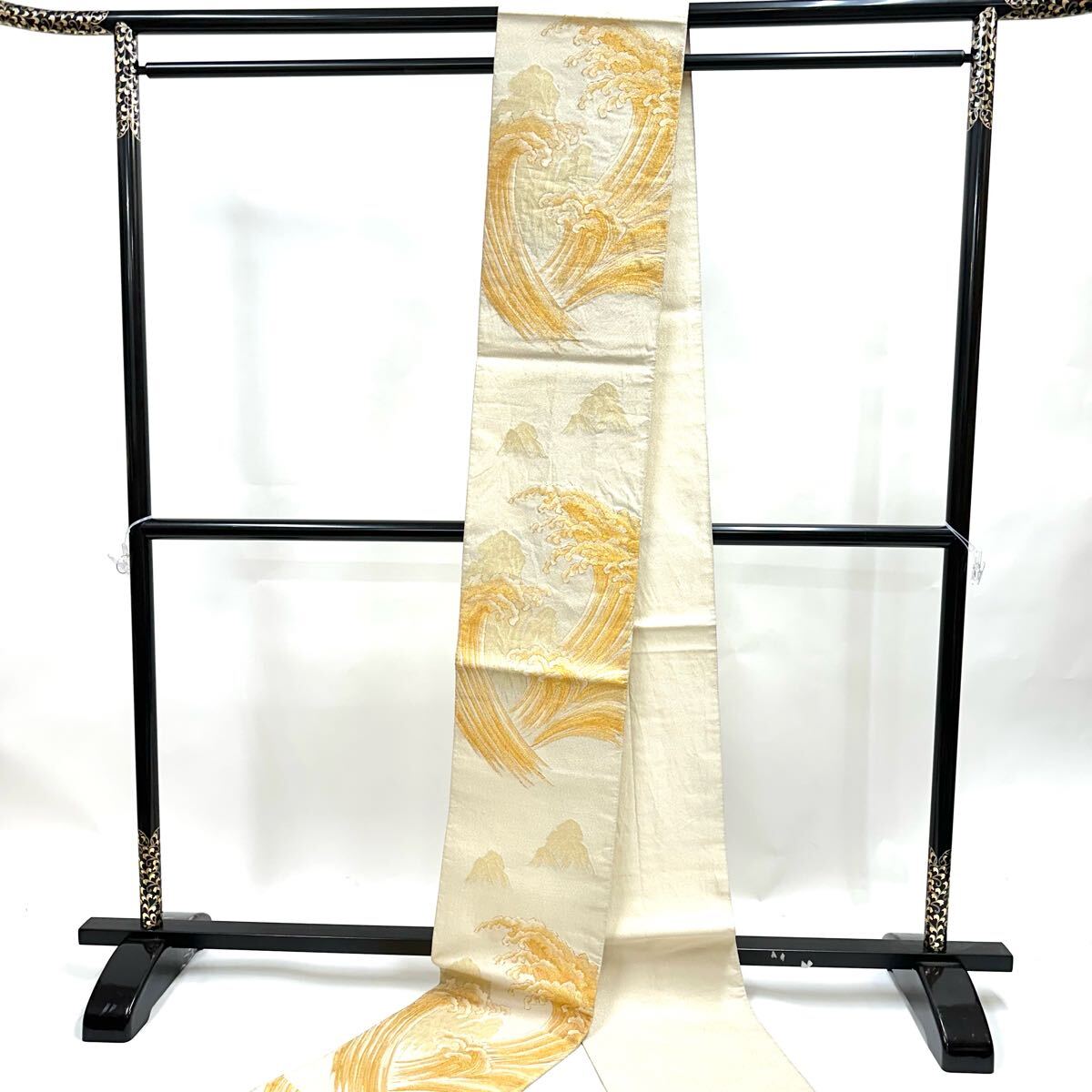 【七福】c664 逸品 高級品 正絹 袋帯 六通 波 金糸 豪華