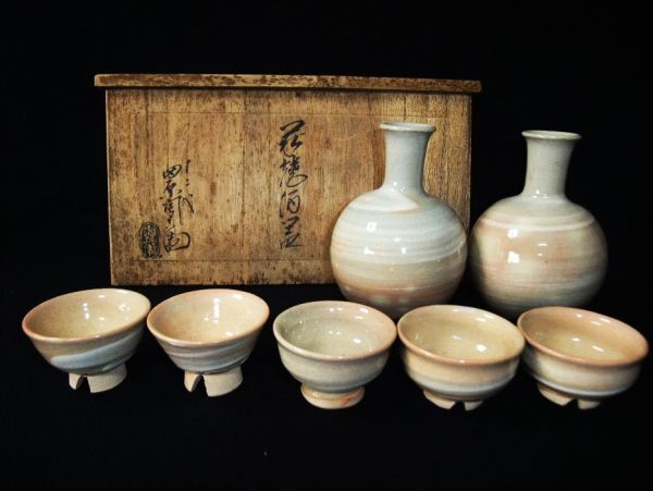 【睦】萩焼 十二代 田原藤兵衛 萩焼深川本窯 酒器 徳利2本 お猪口5個 骨董 時代物 共箱■
