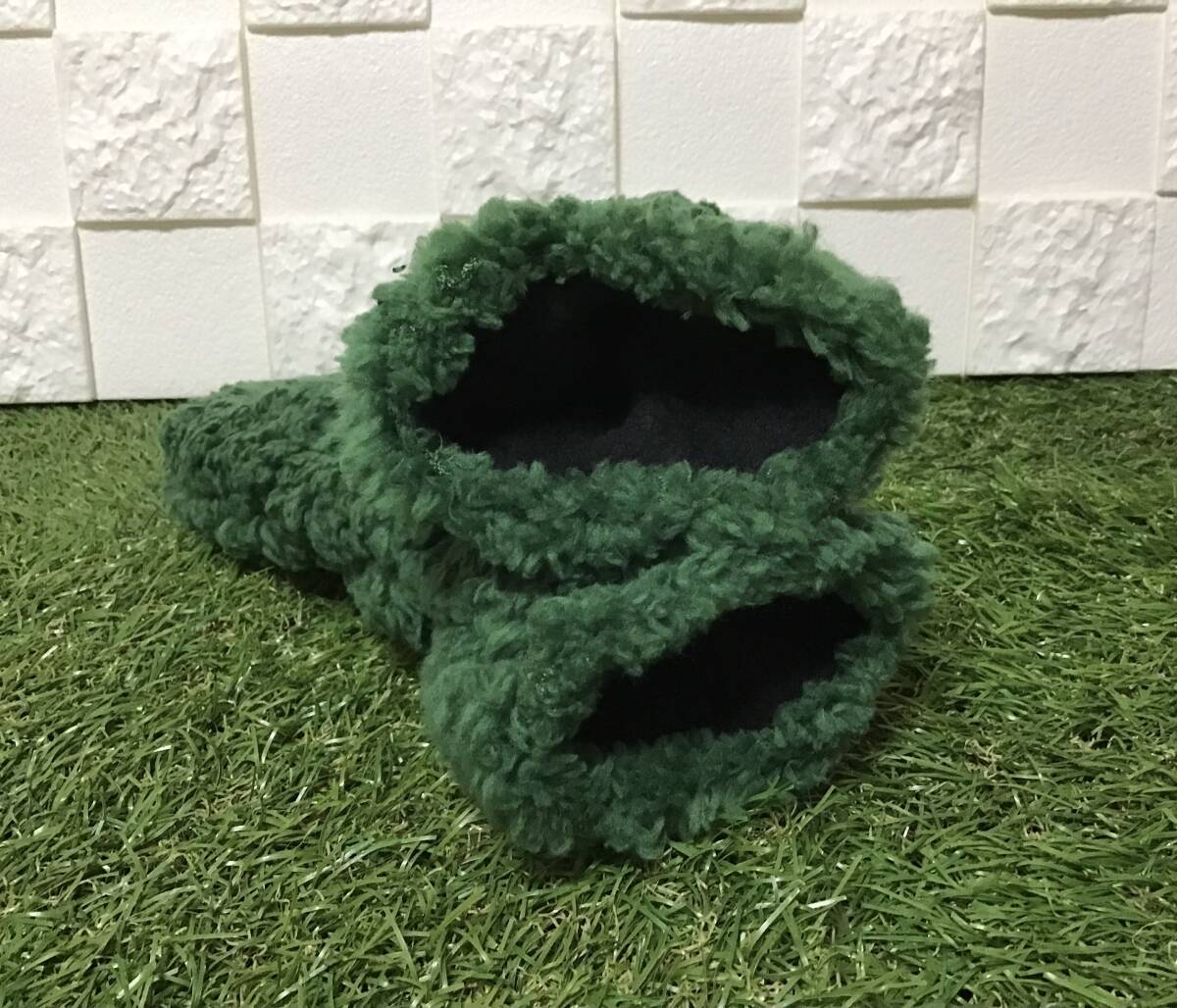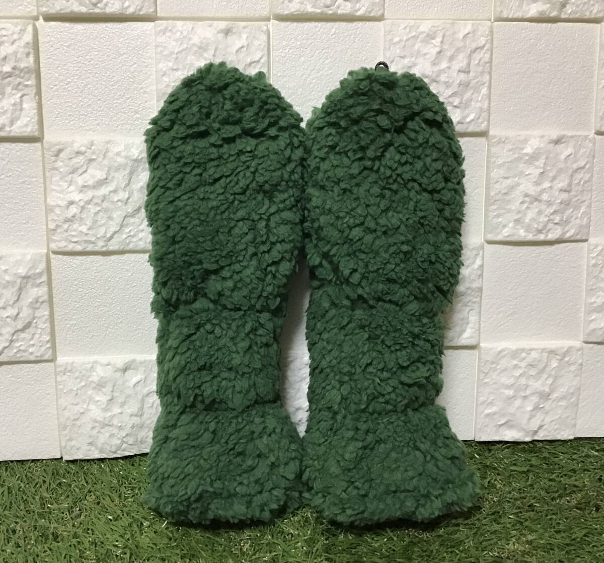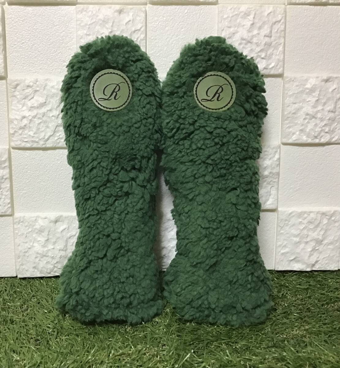 ゴルフ Utカバー2点セット グリーンプードルファー イニシャルヌメ革「R」 内側ブラックフリース ハンドメイド