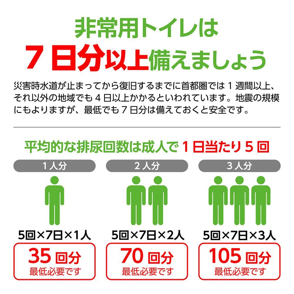 日本防災士機構防災士監修の凝固剤50個セットです。排泄物に凝固剤を振りかけるだけで素早く水分を吸収します。遮光性・防湿性の高いアルミパックで15年保存可能です。50個入りで、防災備蓄だけでなく、介護やアウトドア、車内トイレ対策としてもおすすめです。