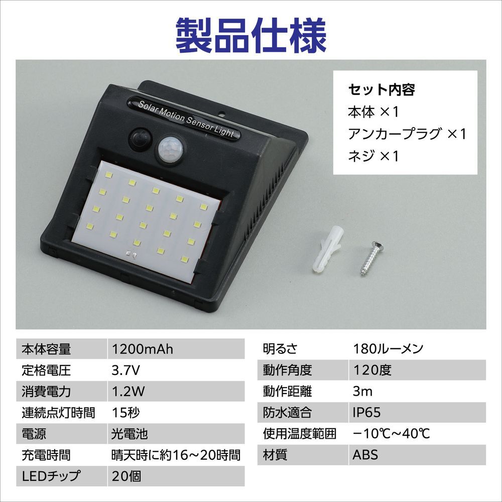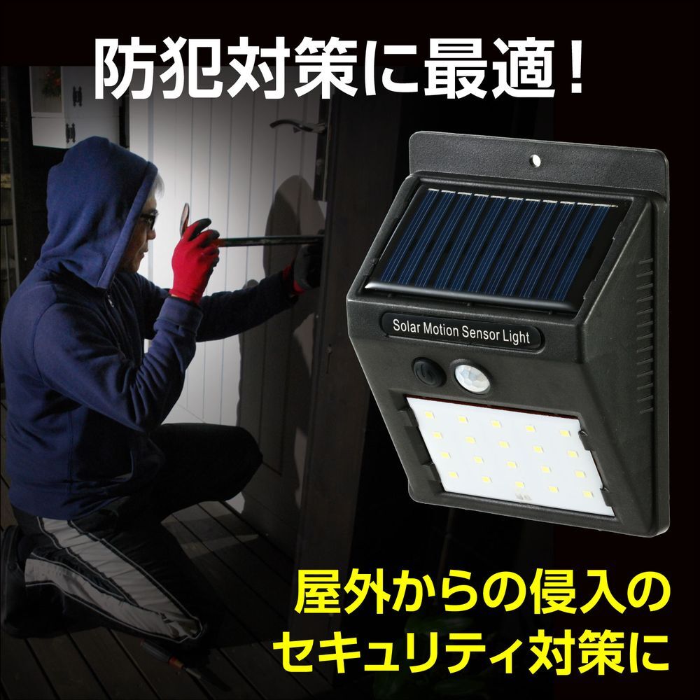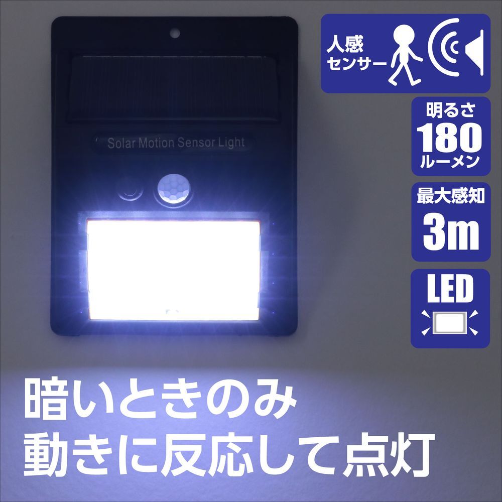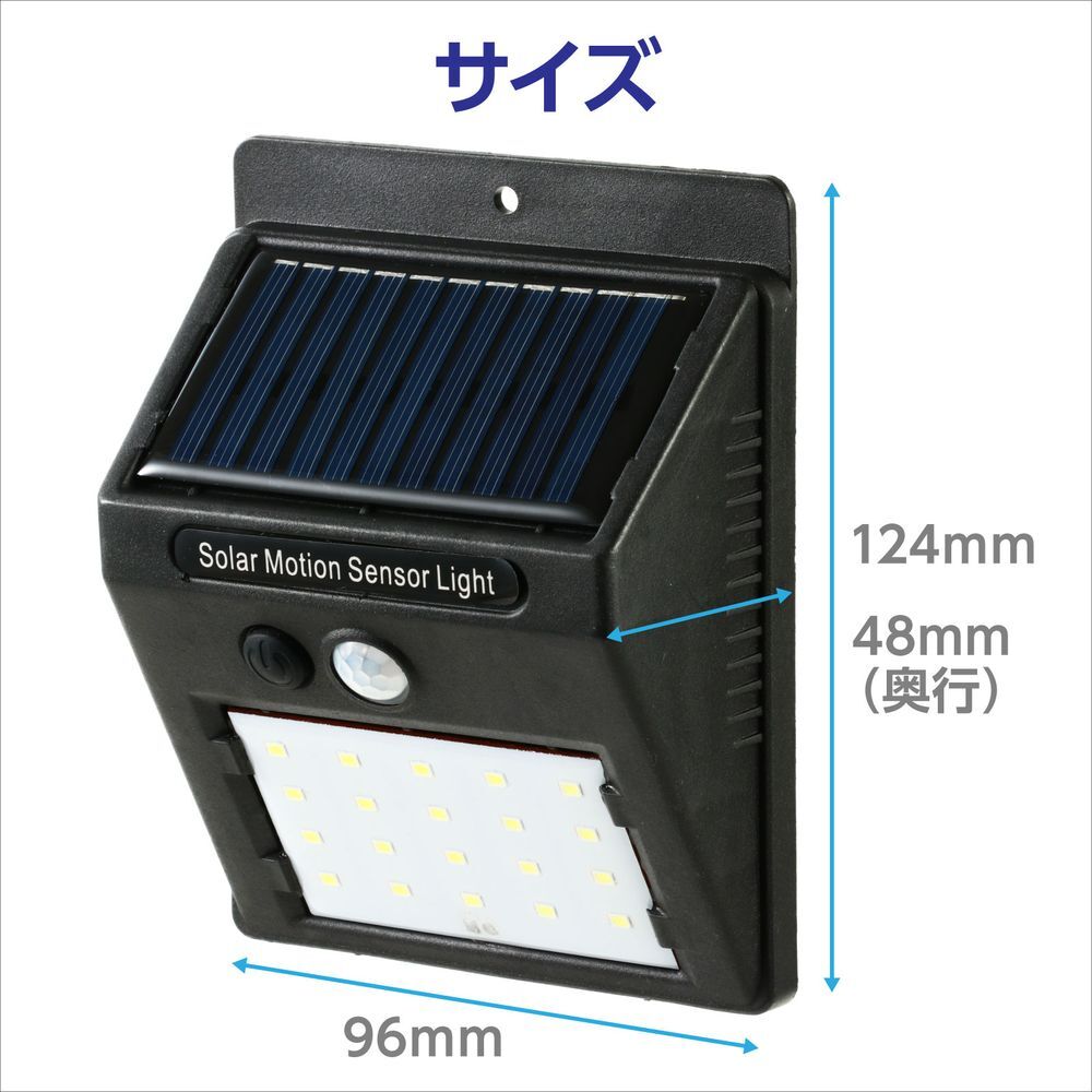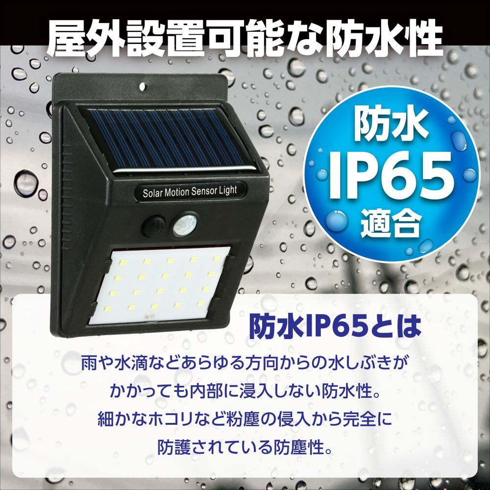雨やホコリに強い防水・防塵IP65適応のセンサーライトです。付属のソーラーパネルで充電するので電池交換が不要で、環境にも優しい一品です。人感センサー機能を搭載しており、人の動きを感知して自動で点灯するため、防犯対策としても活躍します。さらに、壁への取り付けが簡単で、玄関、庭、駐車場など幅広い場所で使用可能。
