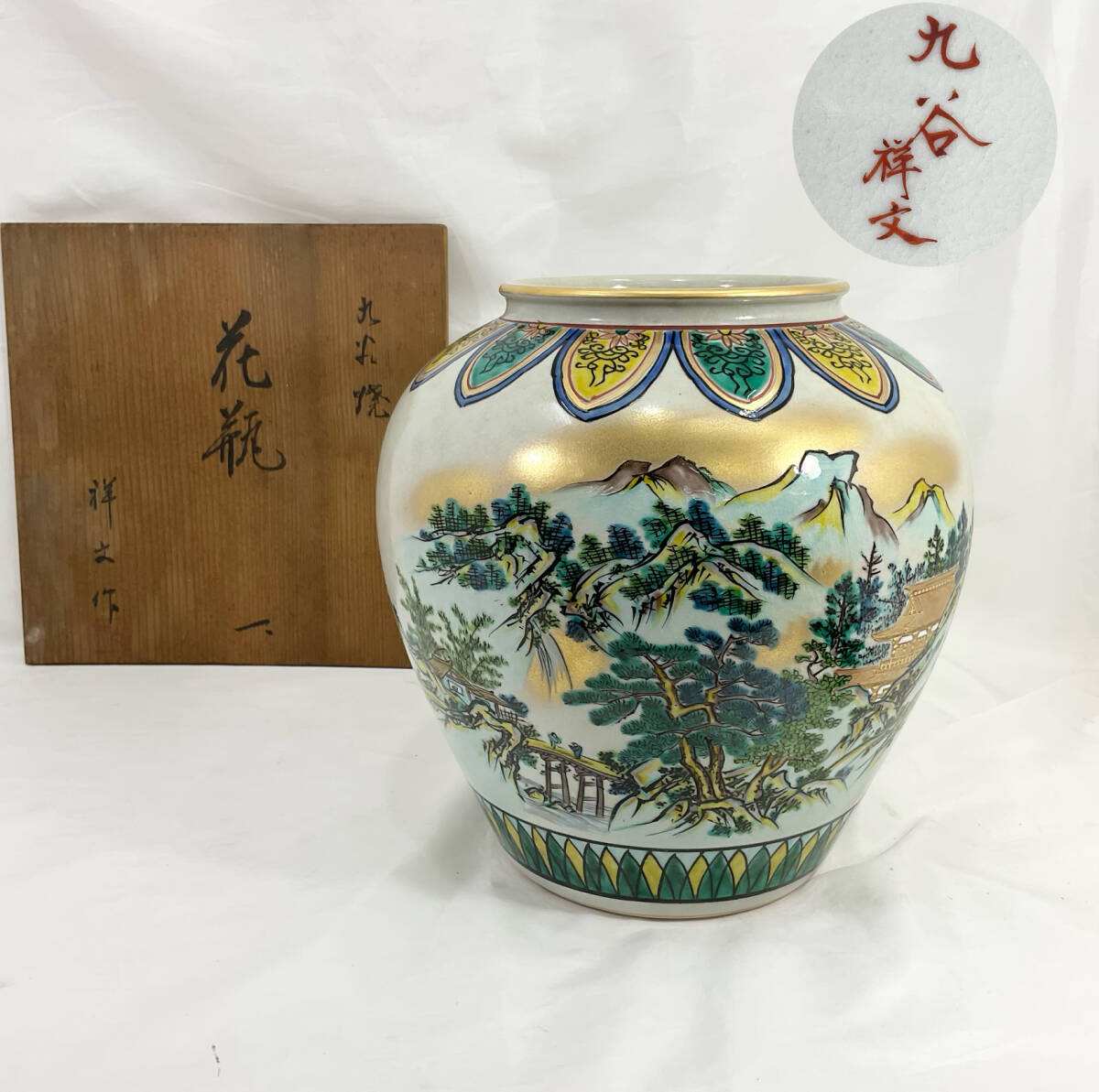 九谷焼 祥文作 花瓶 高さ約25cm 壺 金縁 生花 花器 飾り壺 インテリア 美術品 伝統工芸品 (C62)