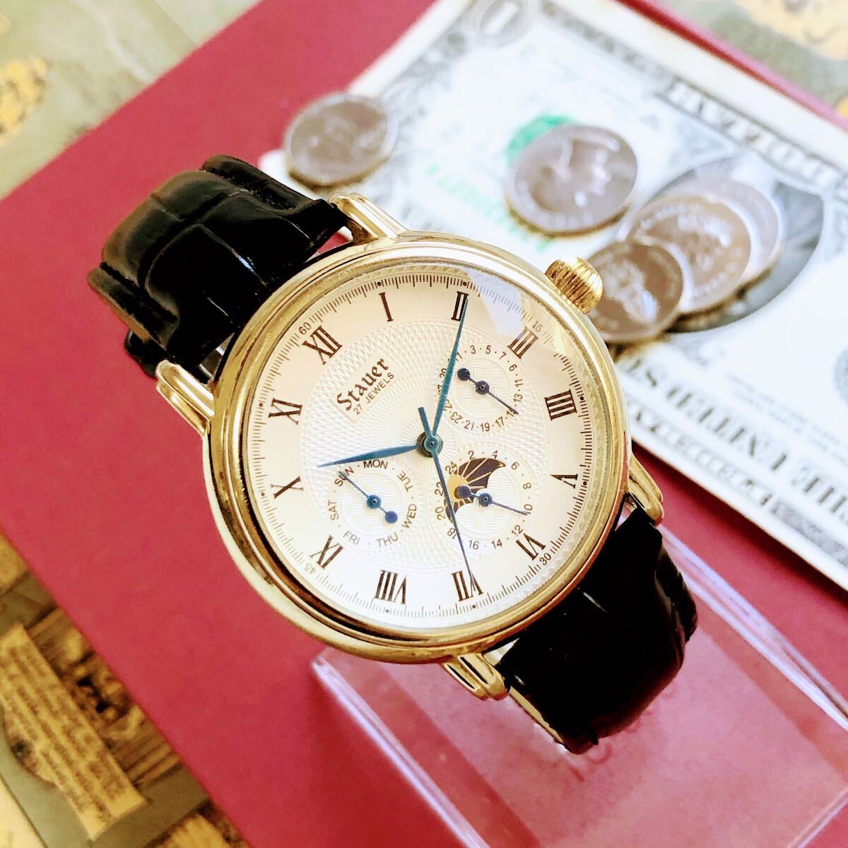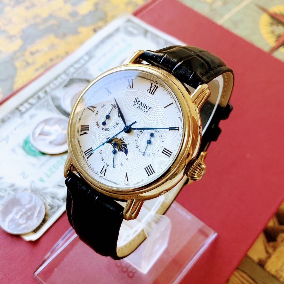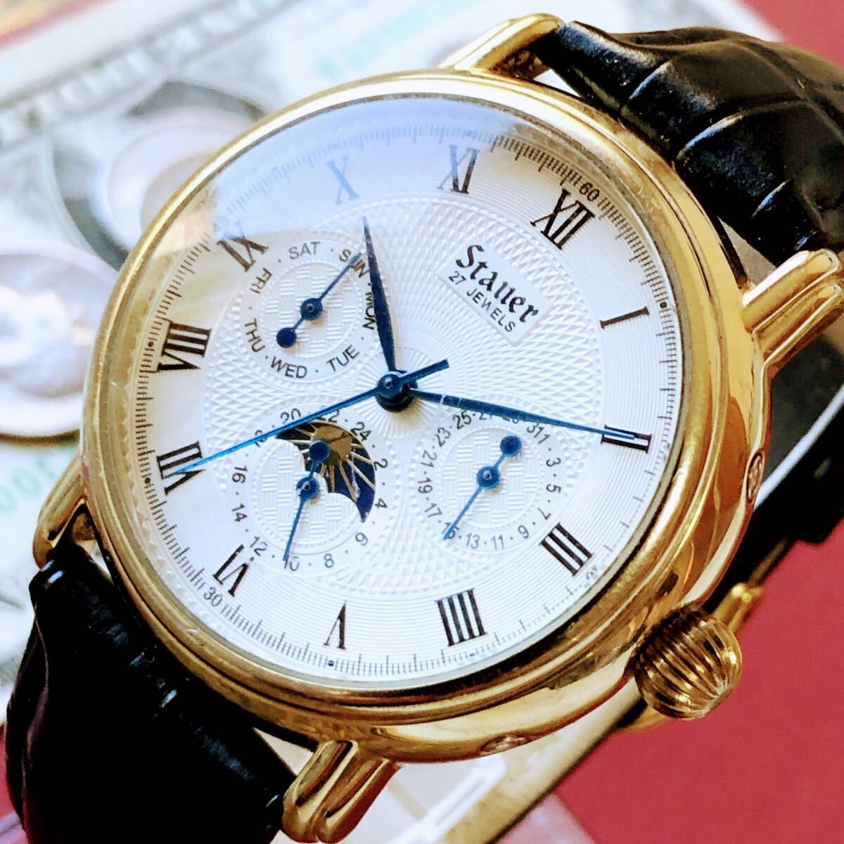 #3686【人気のムーンフェイズ】メンズ 腕時計 Stauer スタウラー 動作品 27石 アンティーク ヴィンテージ 自動巻き 機械式 ローマ数字 美品