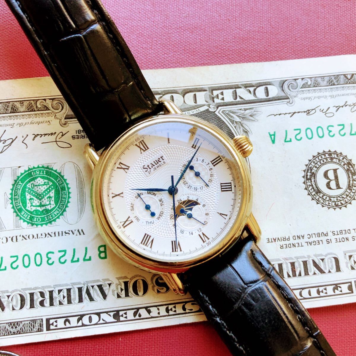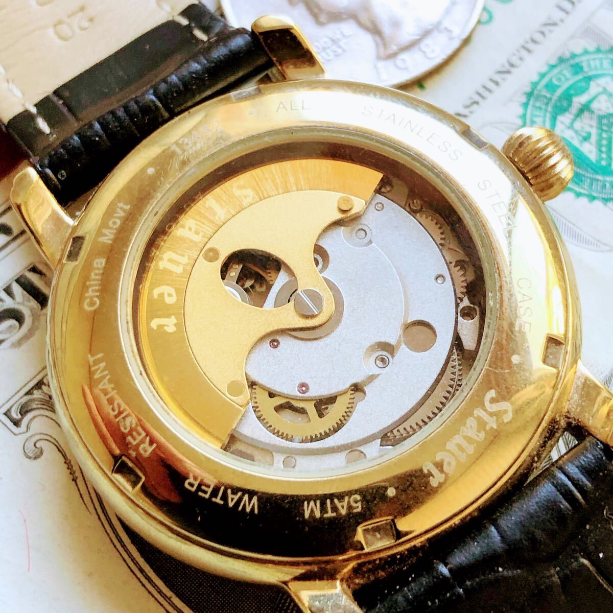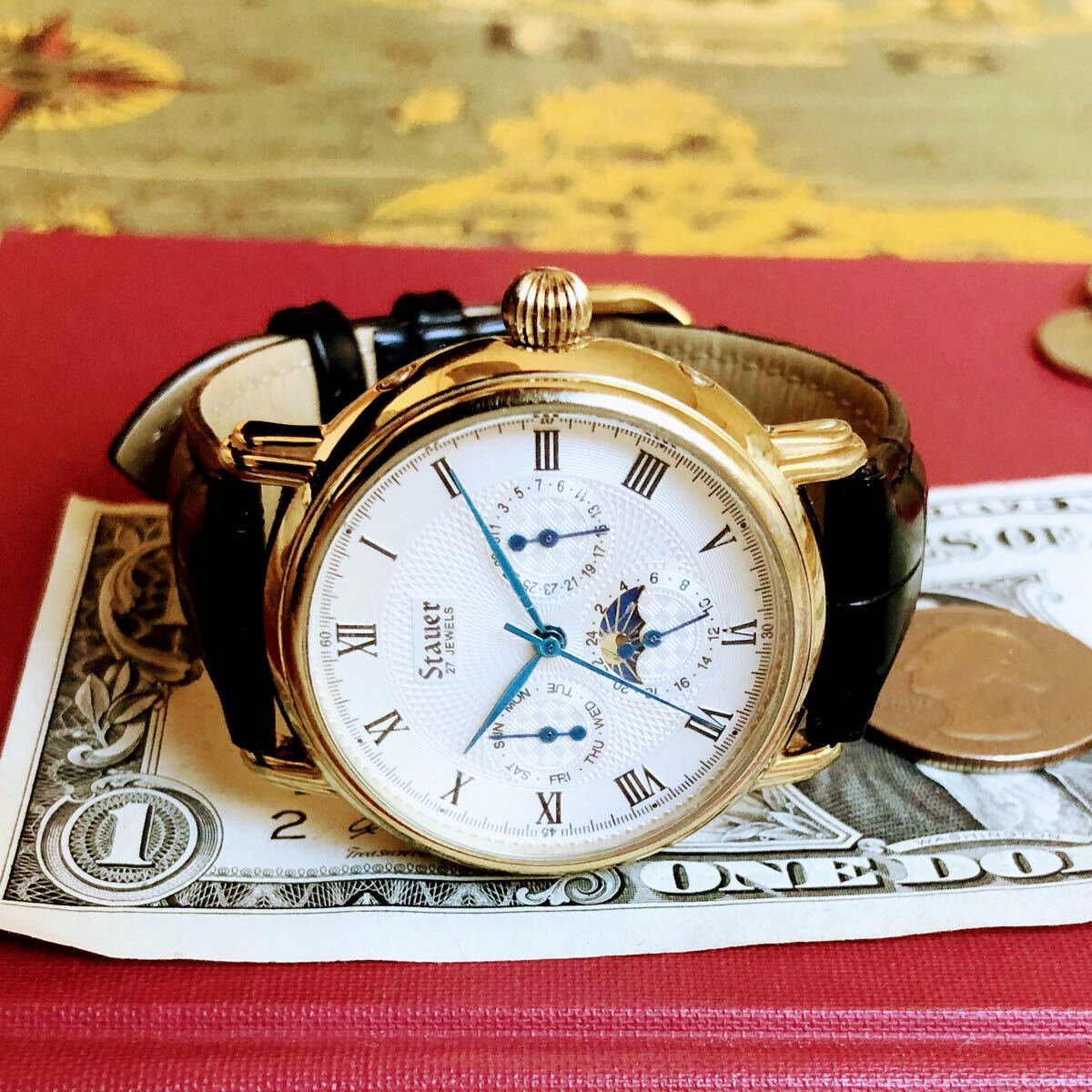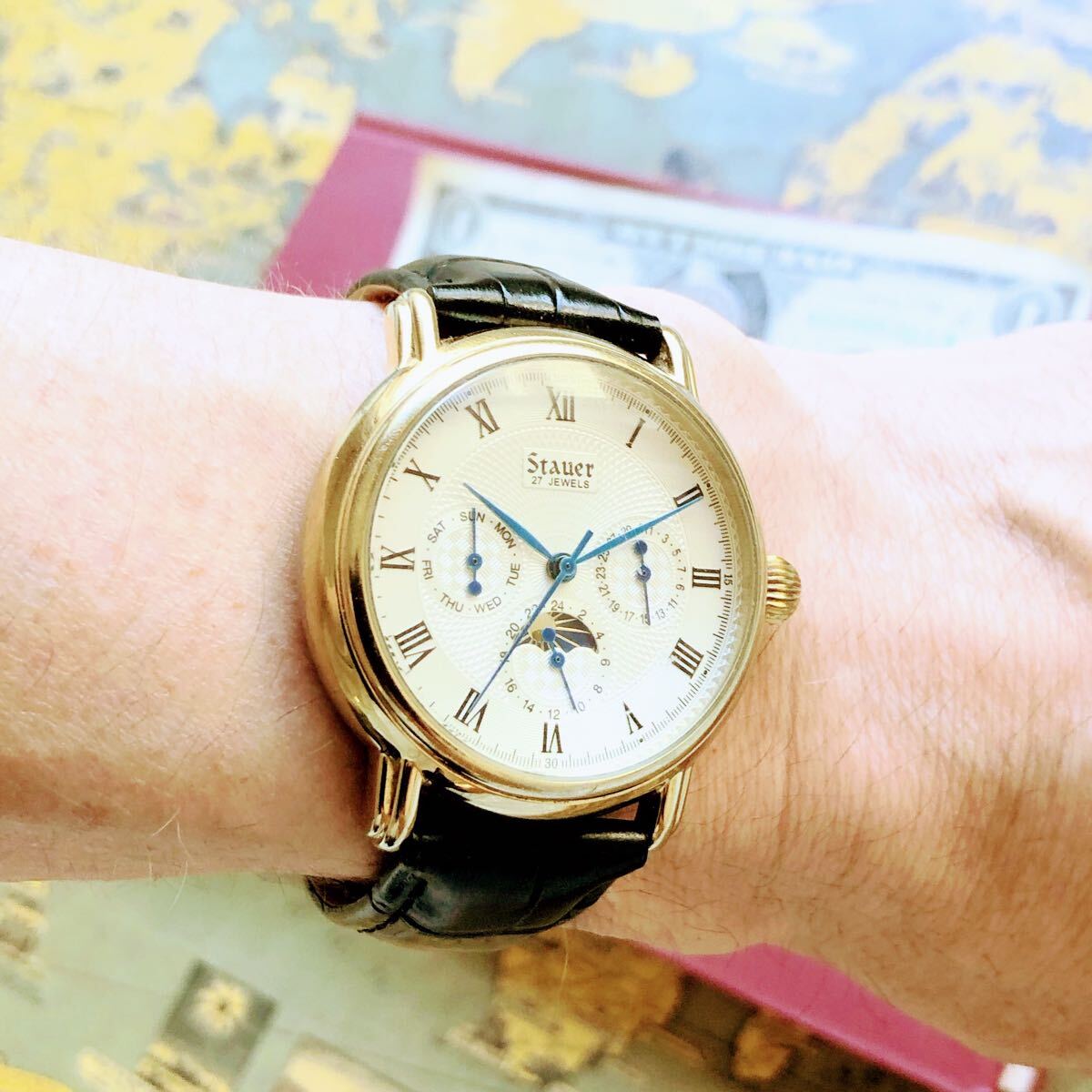 #3686【人気のムーンフェイズ】メンズ 腕時計 Stauer スタウラー 動作品 27石 アンティーク ヴィンテージ 自動巻き 機械式 ローマ数字 美品