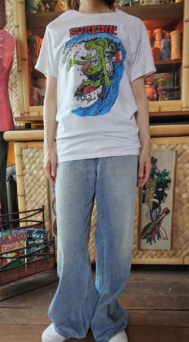 | ラットフィンクTe SURFINK! 白M 正規/新品 故エド・ロス氏の生み出した、永遠のロウブローキャラ、ラットフィンクのUS版Tシャツです。エンジン付きのボードにHang Tenを決めたライディングのグリーンラッツ!かなり有名な絵柄ですが、近年のラットフィンクよりもグロい感じが逆に新鮮です。ヒスミニとかでもパロディ版がでてましたね。バックにはEd Rothロゴの1ポイント入り。 新品・日本未発売のUS正規品です。 Mサイズ 175cm前後の方に良いかと思われます。肩幅50cm, 着丈72cm, 身幅50.5cmです。 モデル 161cm , Sサイズ着用 郵メール便送料¥250(代引き不可・紛失補償なし) THRASHER、Sailor Jerry、ACE CAFE LONDON、LUCKY13、アメキャラ、ムービー等ライセンスTシャツ、RATFINK関連品、バンドTシャツ等取り扱っております。 ** 他にも色々出品中です。 CWbm IWTS | |||||||