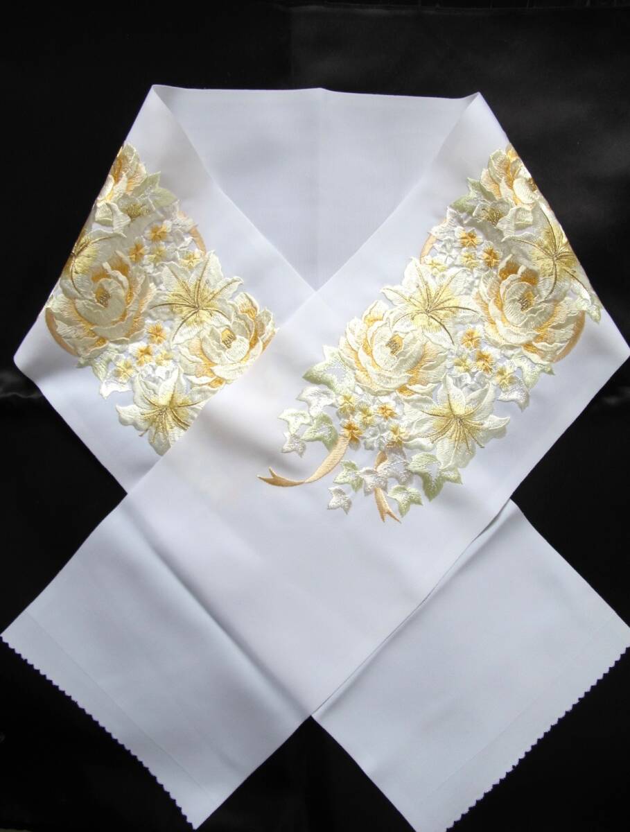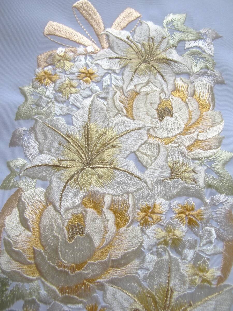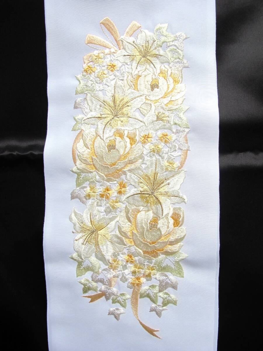 華やかな百合と薔薇のブーケの総刺繍半襟です。 |