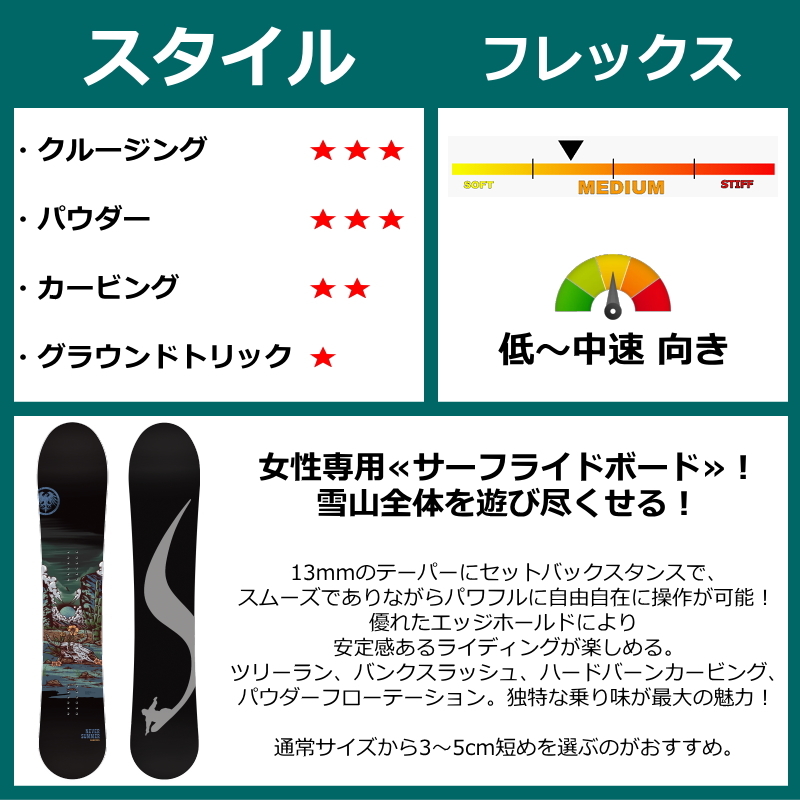 女性専用に設計された雪山全体でサーフライクなライディングを楽しむためのボード。