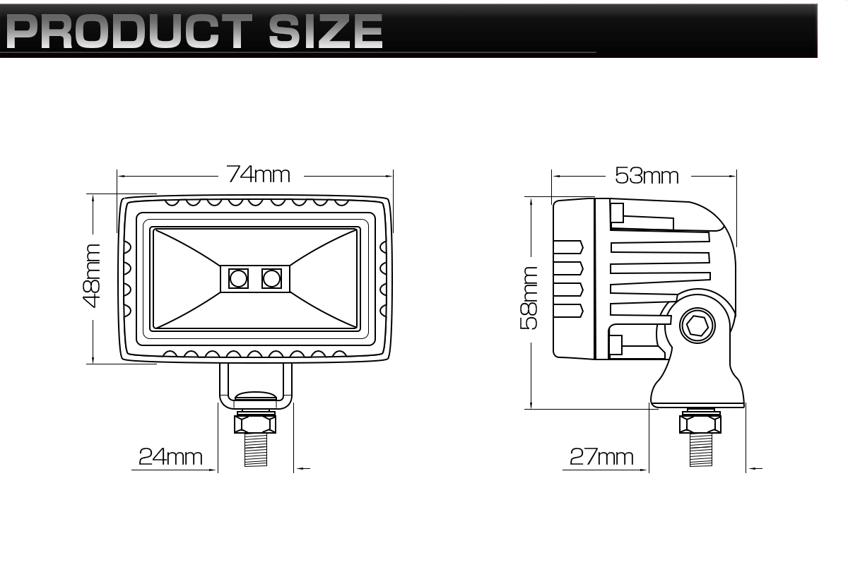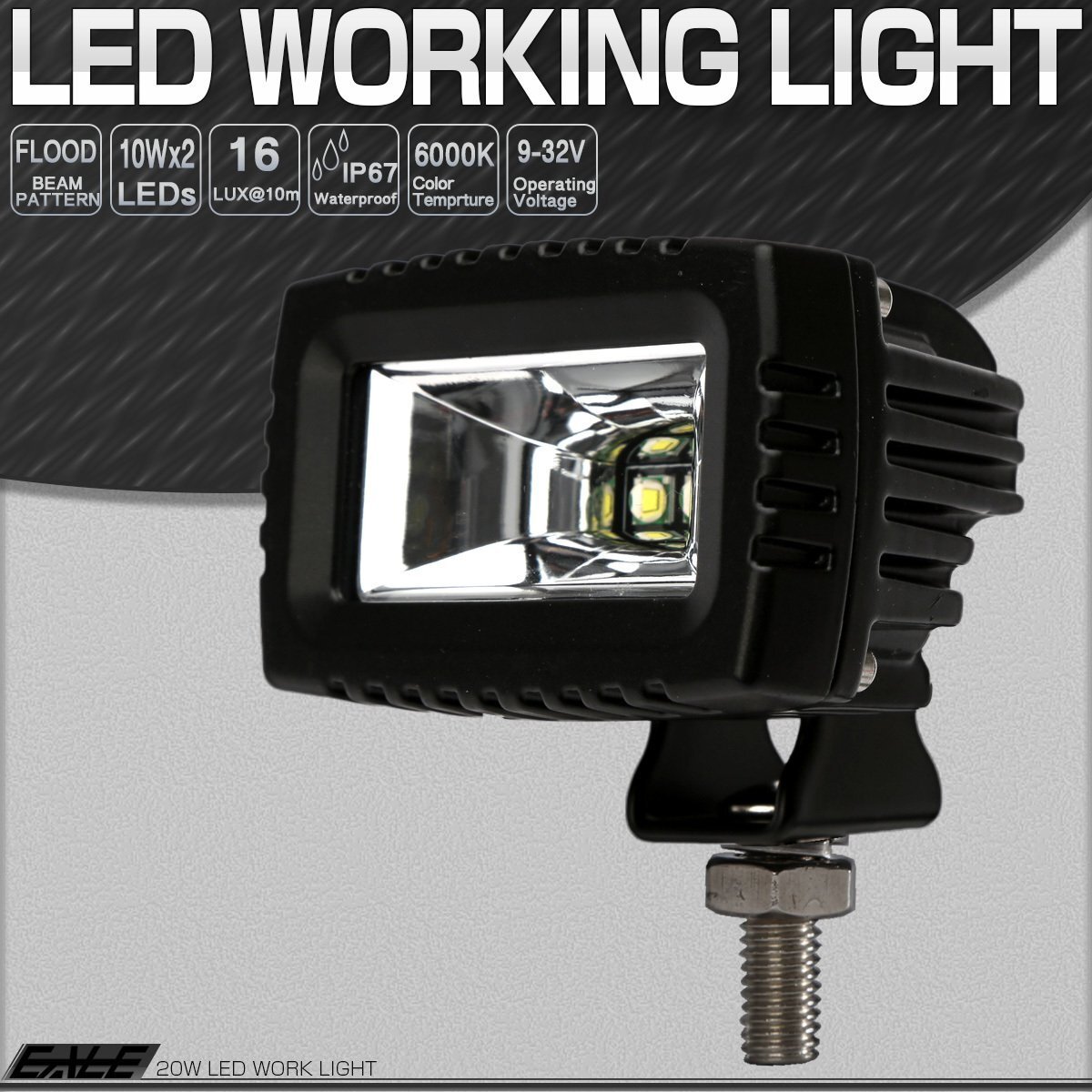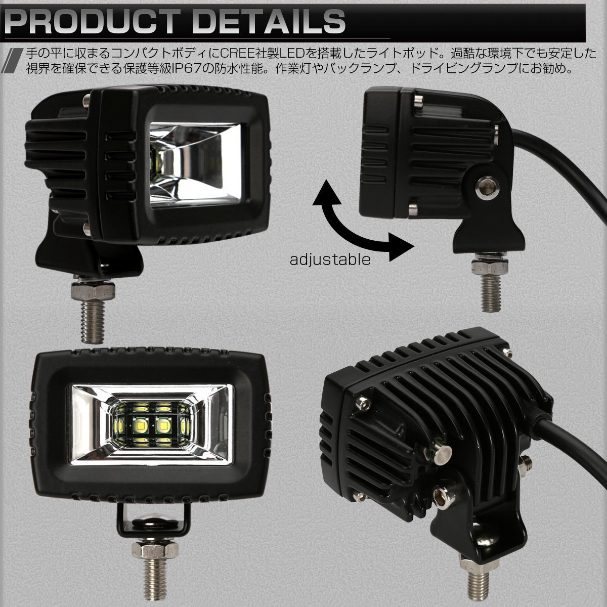 手の平に収まるコンパクトボディにCREE製XM-L素子を搭載したライトポッド。 過酷な環境下でも安定した視界を確保できる保護等級IP67の防水性能。 作業灯や自動車のバックランプ、オフロード車のドライビングライトにお勧めです。 | ■ 20W LED 作業灯 ■ 動作電圧:DC9-32V ■ 消費電力:10.8W ■ 保護等級:IP67 ■ LED:10W×2個 CREE-LED ■ 重量:0.26kg ・同シリーズのライトは⇒ こちら ・その他、ワークライト関連は⇒ こちら | |