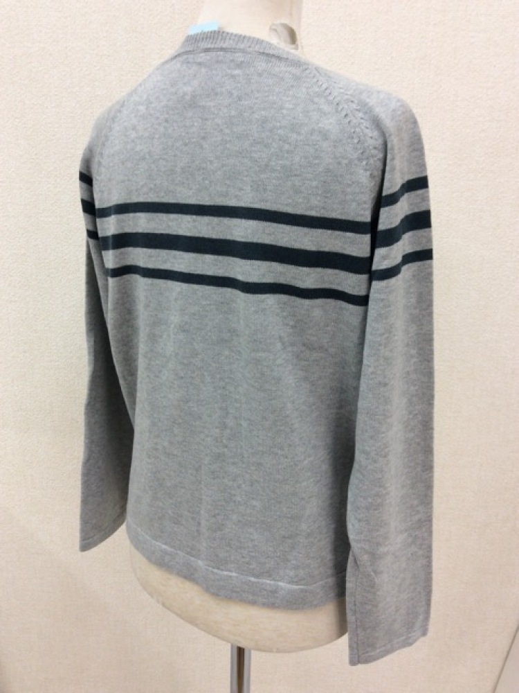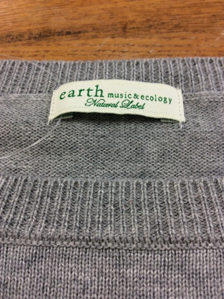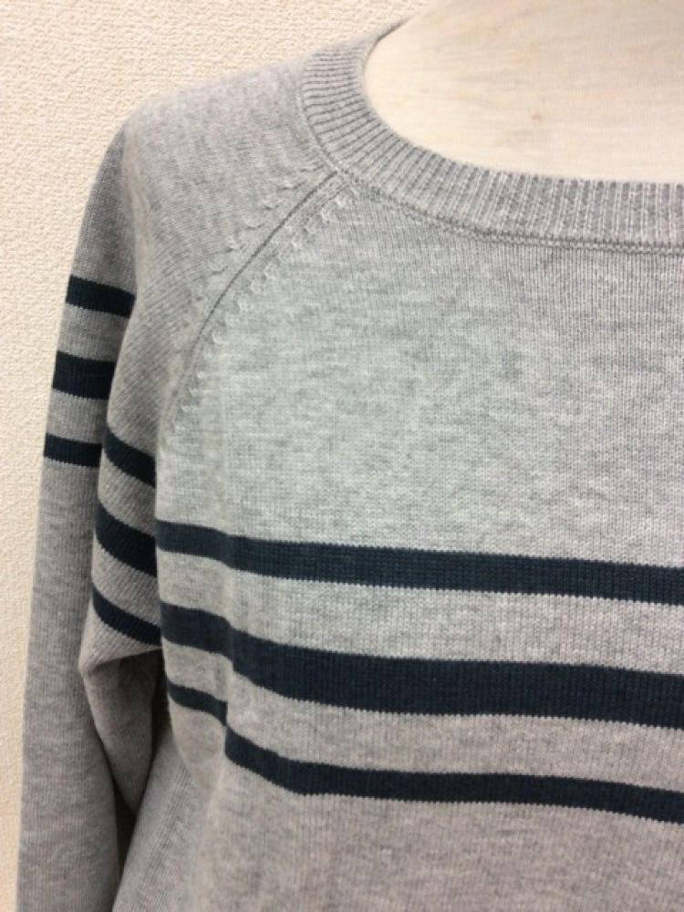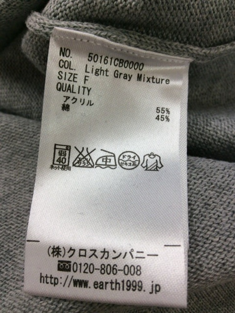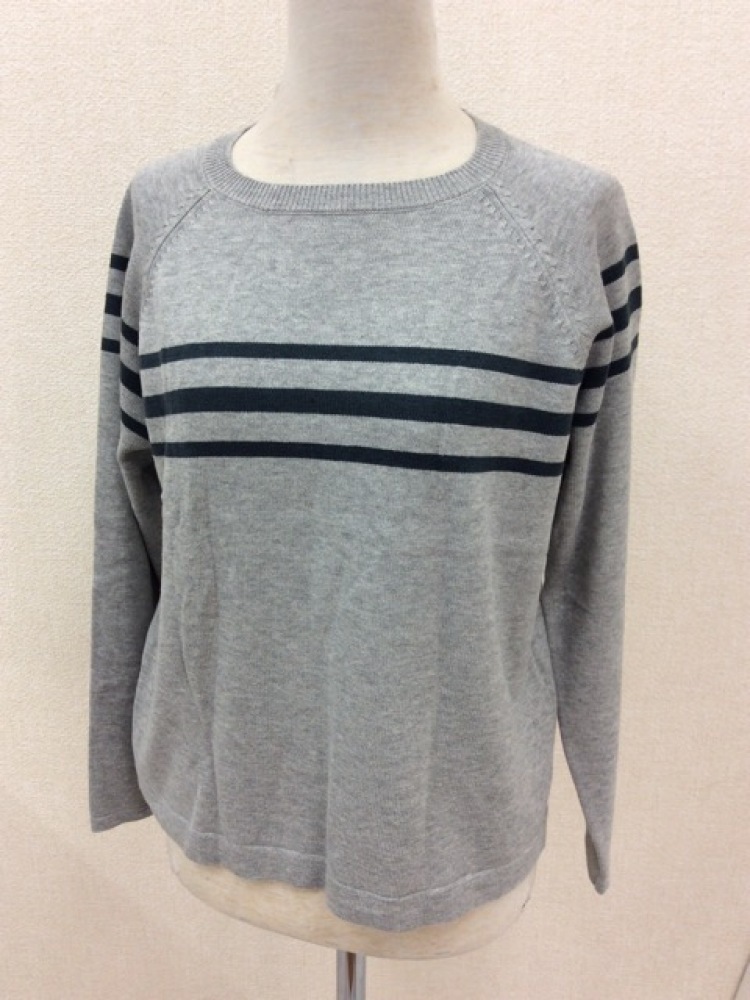 管理番号:99^122494 アースミュージック&エコロジー グレーの薄手ニット 胸元にしま柄 表示サイズ:F 実寸(参考)