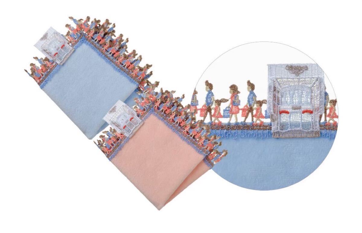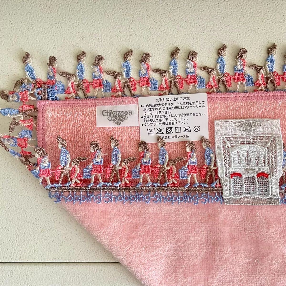 近沢レース店へようこそ!本店を構える元町通りは、ゆっくりとお買い物が楽しめるショッピングストリート。モチーフレースは、近沢レース店本店のエントランスです。お買い物を楽しむお客様を表現した、愉快なデザイン。横浜にいらした際には、是非本店に遊びにいらしてください。