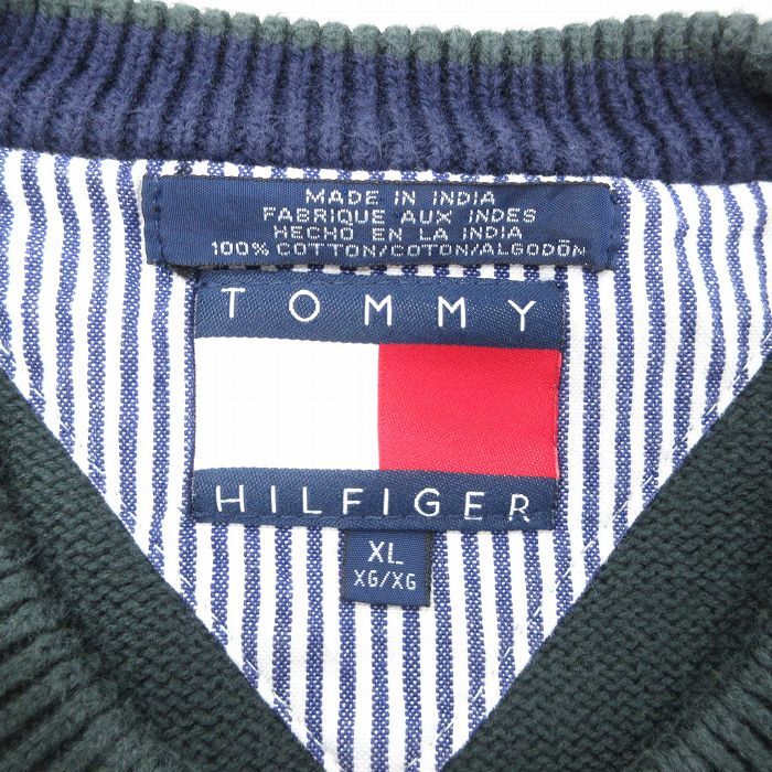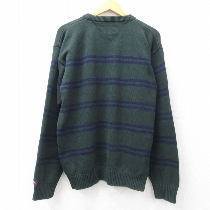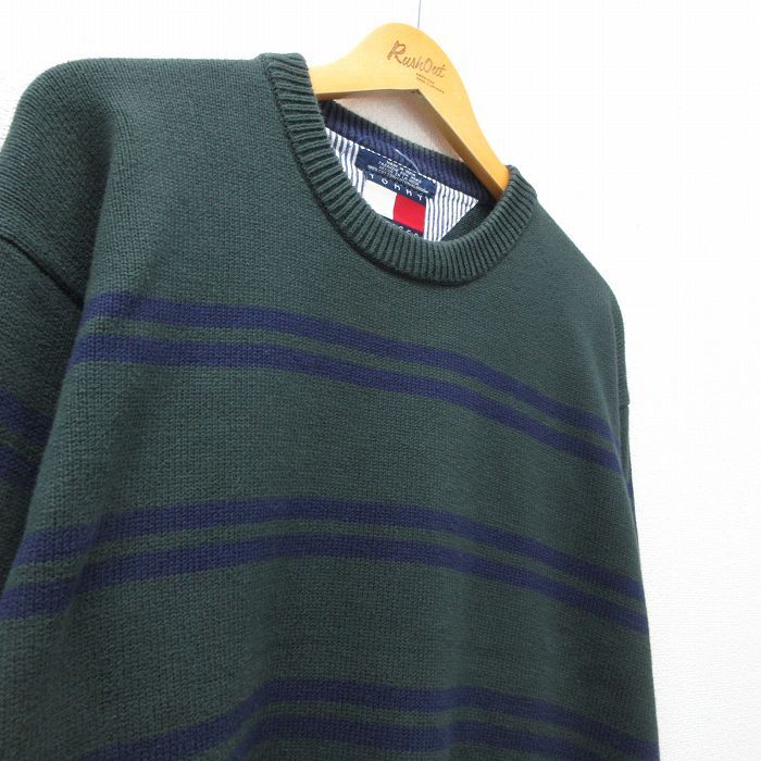 【商品名】 XL★古着 トミーヒルフィガー 長袖 ブランド セーター メンズ 90年代 90s コットン クルーネック 緑他 ボーダー【spe】