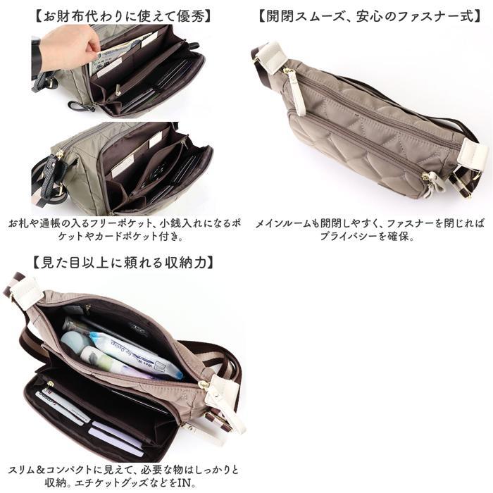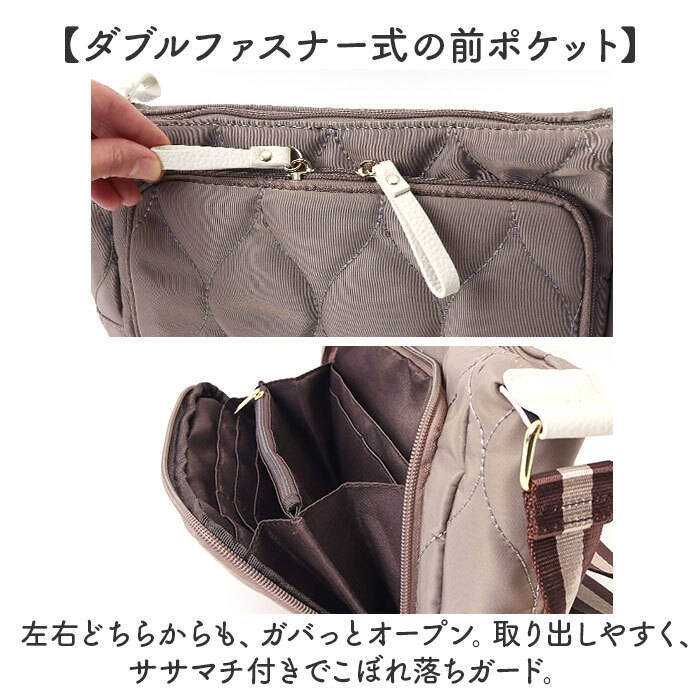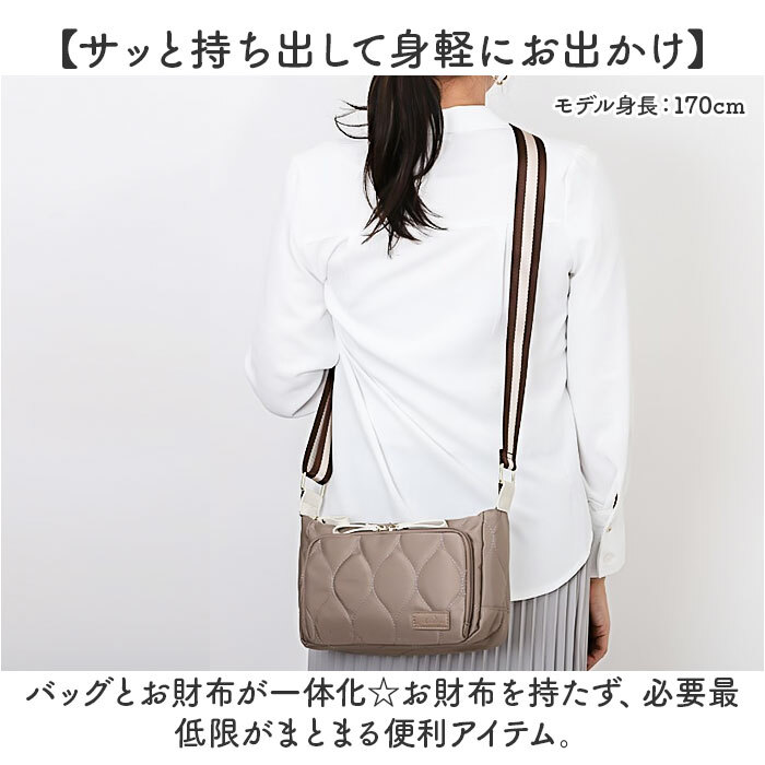 | 商品説明 | ・・【お財布不要のミニマルスタイル】 ・嬉しいお財布機能付き◎「LIZDAYS キルティングナイロンミニショルダーバッグ」。 ・【サッと持ち出して身軽にお出かけ】 ・バッグとお財布が一体化☆お財布を持たず、必要最低限がまとまる便利アイテム。 ・【ダブルファスナー式の前ポケット】 ・左右どちらからも、ガバっとオープン。取り出しやすく、ササマチ付きでこぼれ落ちガード。 ・【お財布代わりに使えて優秀】 ・お札や通帳の入るフリーポケット、小銭入れになるポケットやカードポケット付き。 ・【開閉スムーズ、安心のファスナー式】 ・メインルームも開閉しやすく、ファスナーを閉じればプライバシーを確保。 ・【見た目以上に頼れる収納力】 ・スリム&コンパクトに見えて、必要な物はしっかりと収納。エチケットグッズなどをIN。 ・【サクッと取り出せて迷子知らず】 ・内側に3つ、外側背面に2つのポケット。バッグの中で小物を探す手間が不要。 ・【使い心地軽やかでストレスフリー】 ・体に負担をかけない軽量設計。ショルダーの長さを調節し、肩掛けも斜め掛けもスマート◎ ・【メインもサブ使いも自由自在】 ・これ1つでお出かけも良し。お子さまとのお出かけや、旅行のサブバッグとしても重宝。 ・【丈夫でキレイなフォルムをキープ】 ・耐久性のある高密度ナイロンを使用。崩れしにくく、ガシガシ使えるのが嬉しい! ・【ちょっとの雨なら大丈夫】 ・表面は汚れや水滴を弾きやすい、撥水加工済み。お手入れも拭き取るだけ。 ・(※)完全防水ではありません。 ・【上品な印象のキルティングデザイン】 ・落ち着きのあるカラーに、ふっくらキルティング♪どんなコーデにも素敵にマッチ。 ・【ディテールにもこだわりをプラス】 ・光沢感のあるライン入りショルダー。引き手やつなぎ目には、PUレザーを部分使い☆ ・【ポケット仕様】 ・内側:ファスナーポケット×1、オープンポケット×2 ・前面:ダブルファスナーポケット×1(内側にファスナーポケット×1、フリーポケット×3、カードポケット×8) ・背面:オープンポケット×2 |