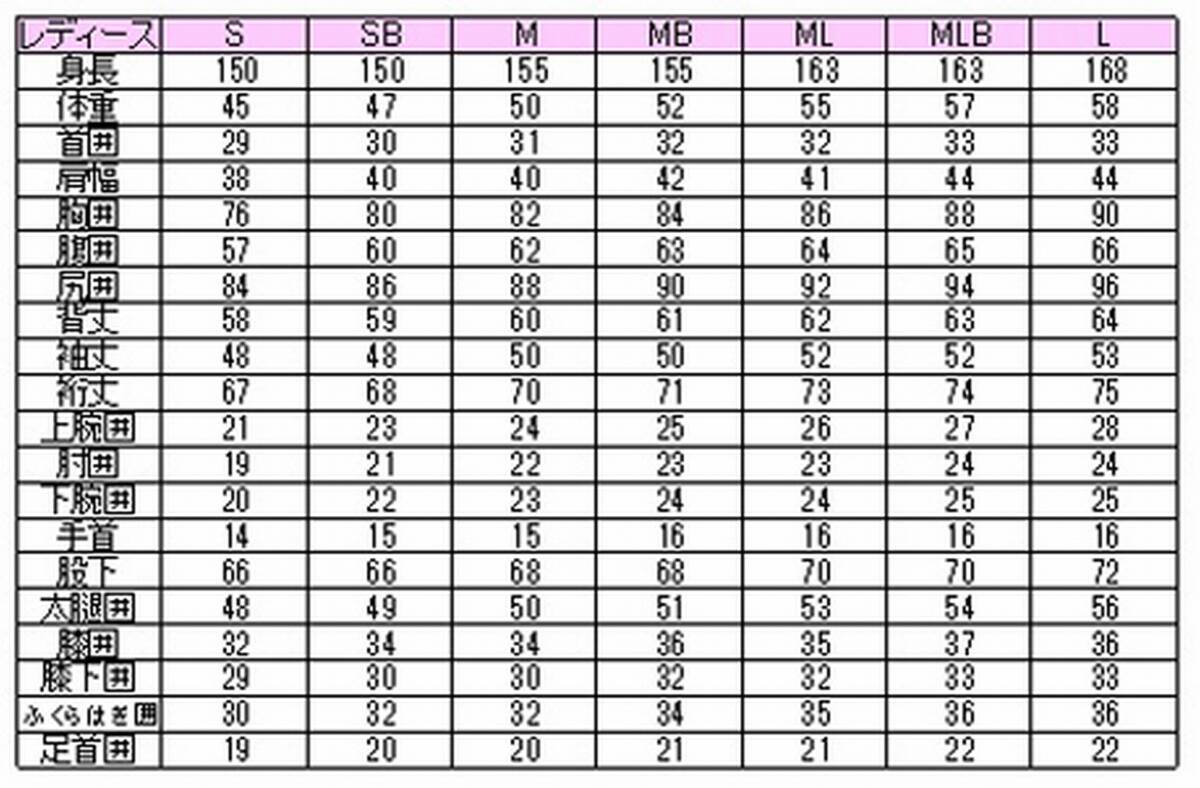 | レディース | S | SB | M | MB | ML | MLB | L | ||||||||