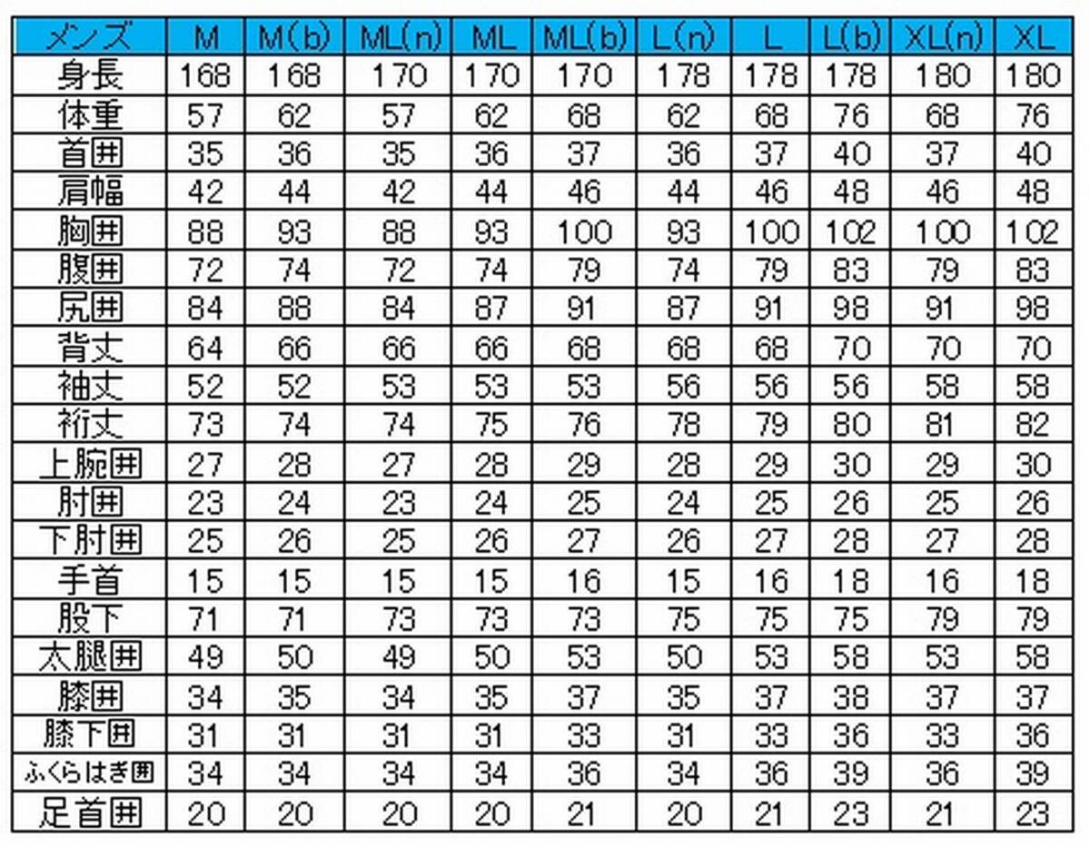 | メンズ | M | M(b) | ML(n) | ML | ML(b) | L(n) | L | L(b) | XL(n) | XL | |||||||||||