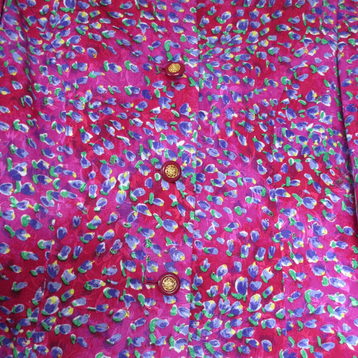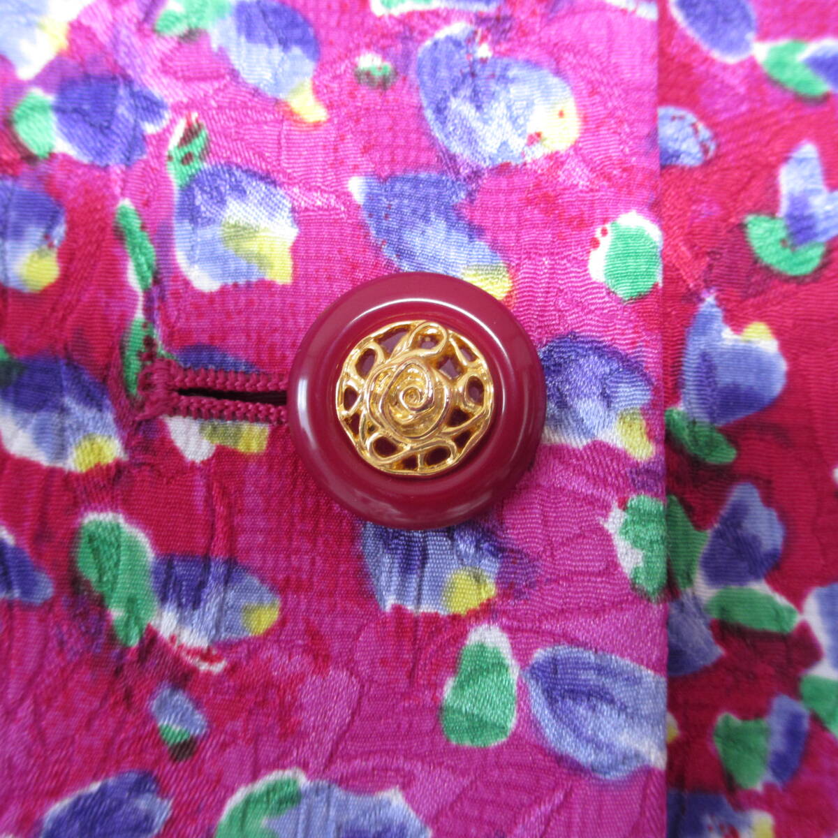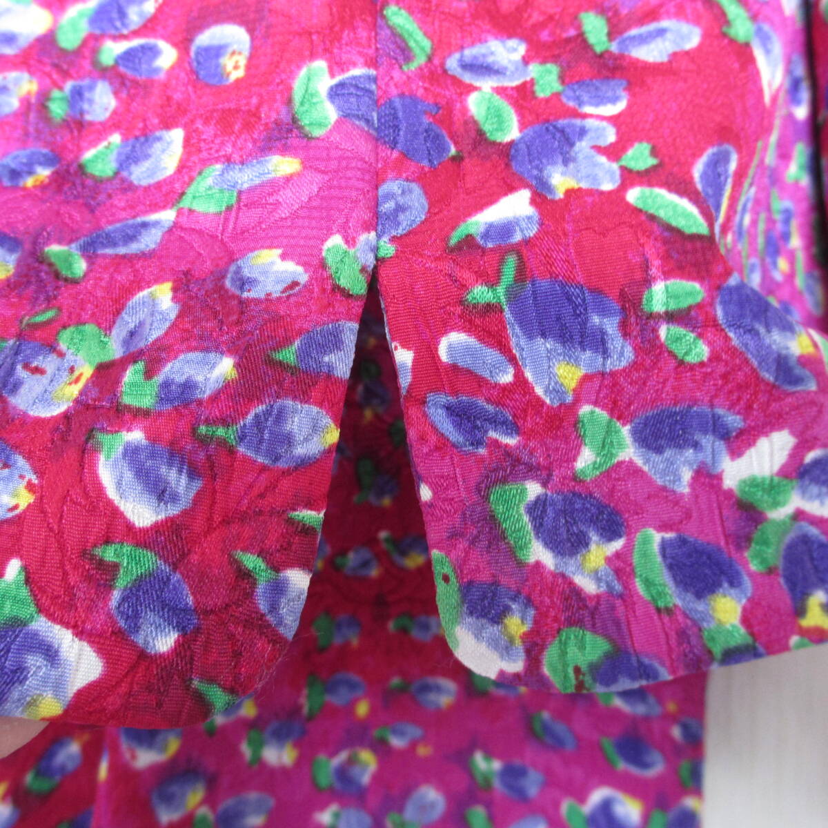 華やかな濃ピンク系の膨れ織の布地に多色の花柄模様が、