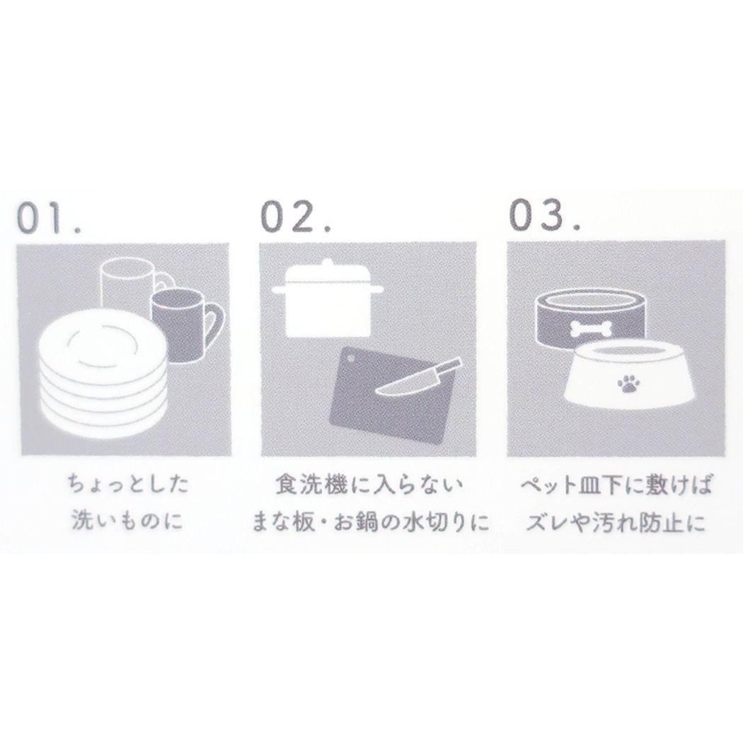 マイクロファイバーの生地でぐんぐん吸水 人気絵本[miffy]グッズに可愛いアイテム登場こちらはかわいい[水切りマット]食洗器に入らないお鍋やフライパンの水切りや、ちょっとした洗い物に最適。中材に程よい厚みのポリウレタンが入っているので、クッションとなり食器をやさしくふんわりと受け止めてくれます。だからガラス製品やグラスなどのデリケートな食器類も安心。使わないときはコンパクトに折りたたんだり、リボンをフックに引っかえて収納出来ます。更に洗濯可能なので、清潔にご使用頂けます。サイズ:400x300mm素材:表生地/ポリエステル100%、中材/ポリウレタンフォーム