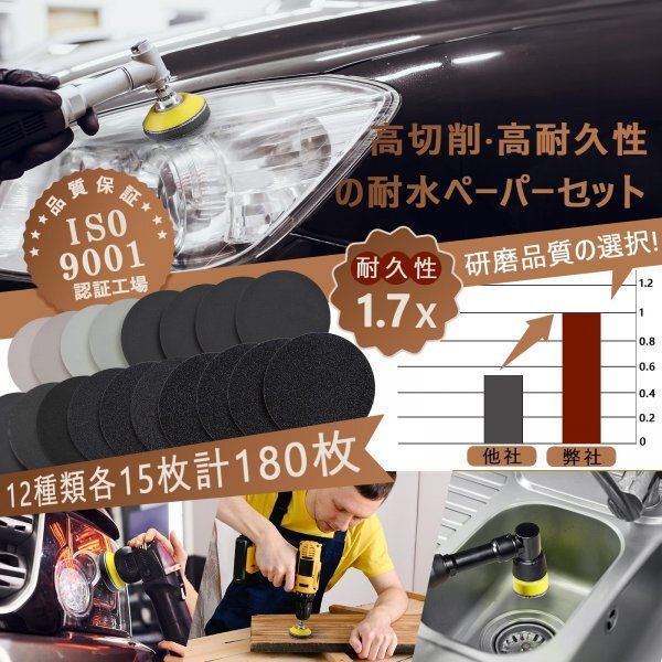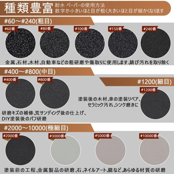 - タイプ:粗目から細目まで12タイプ(#60, #80, #100, #150, #240, #400, #800, #1200, #2000, #3000, #5000, #10000 各15枚)