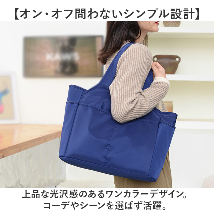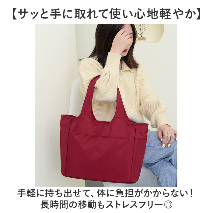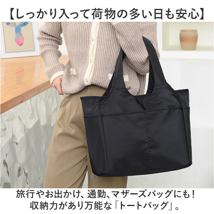 商品説明 | ・・【しっかり入って荷物の多い日も安心】 ・旅行やお出かけ、通勤、マザーズバッグにも!収納力があり万能な「トートバッグ」。 ・【オン・オフ問わないシンプル設計】 ・上品な光沢感のあるワンカラーデザイン。コーデやシーンを選ばず活躍。 ・【サッと手に取れて使い心地軽やか】 ・手軽に持ち出せて、体に負担がかからない!長時間の移動もストレスフリー◎ ・【開閉スムーズ、安心の天ファスナー】 ・ガバっと開いて出し入れしやすく、ファスナーを閉じればセキュリティ面も安心。 ・【A4サイズ対応で使い勝手抜群】 ・A4サイズがすっぽり収まり、程よいマチ設計で荷物がひとまとめ。 ・【タブレットも入るあおりポケット】 ・前後のあおりポケットは、マグネットでワンタッチ開閉。タブレットが入るサイズ感。 ・【サッと取り出せて迷子知らず】 ・ペットボトルが入るサイドポケットや、小物収納に便利な内側&外側ポケットを装備。 ・【肩掛けできてストレスフリー】 ・ハンドルは肩に掛けやすい長さに設計。幅が広めで食い込みにくい! ・【お気に入りを選べるカラー】 ・大人女子にぴったりな、落ち着きのあるカラーをラインナップ。 ・【ポケット仕様】 ・内側:ファスナーポケット×1、オープンポケット×2 ・メインルーム前後:マグネット式あおりポケット×2 ・前面:オープンポケット×2 ・サイド:オープンポケット×2 ・背面:ファスナーポケット×1 |