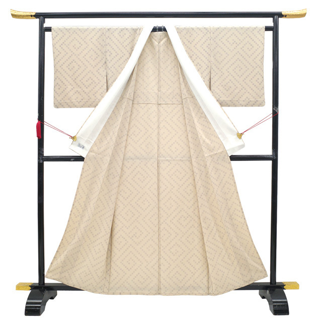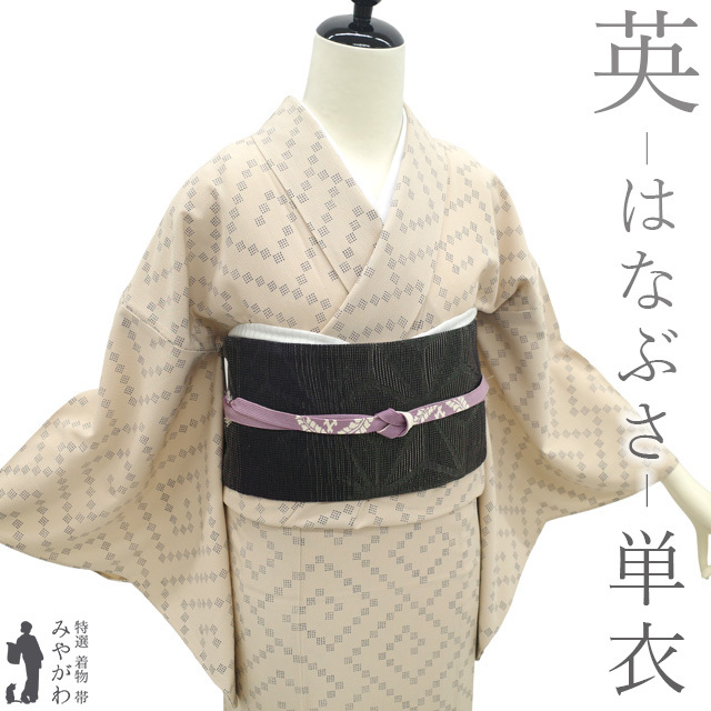 【中古】 小紋 単衣 着物 リサイクル 英 はなぶさ 謹製 洗える着物 ポリエステル 春 秋 ベージュ スクエア 菱 高級 カジュアル 春秋 洗える 着物 単衣 仕立て上がり 身丈160 裄64.5 Mサイズ みやがわ sb16228
