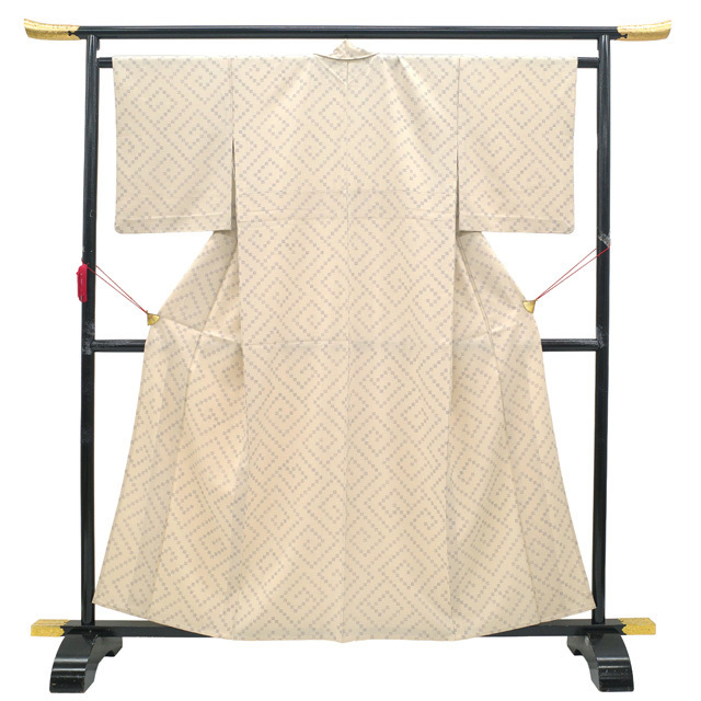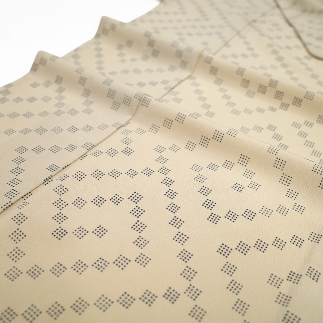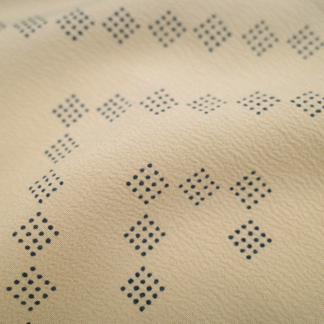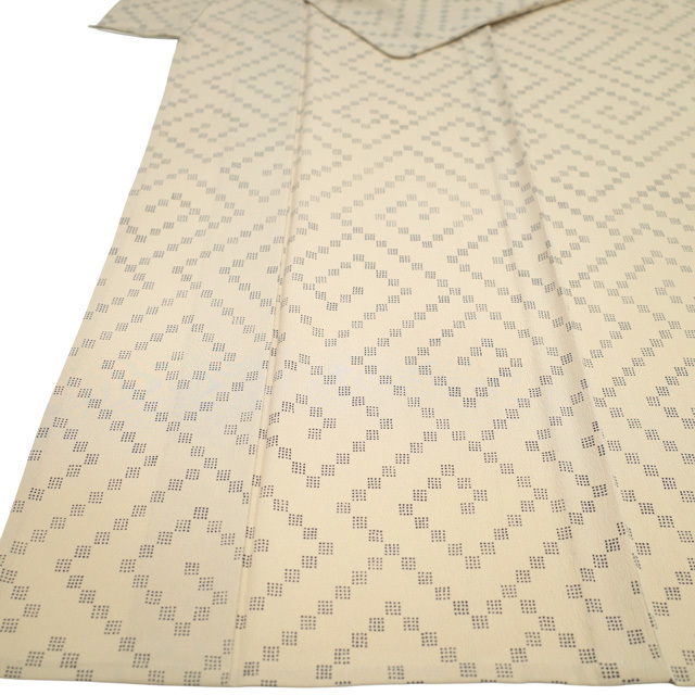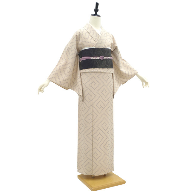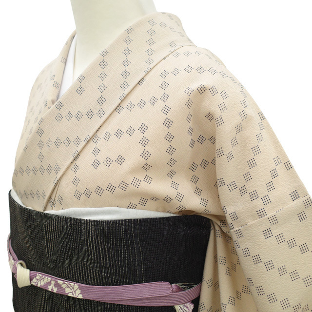 こちらのお着物は、ベージュ色地に黒でモダンなスクエア柄がデザインされています。