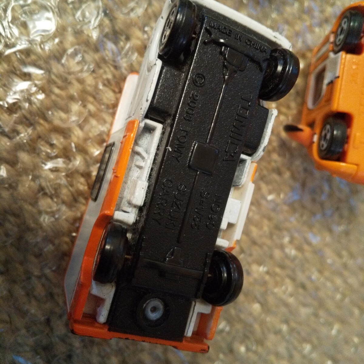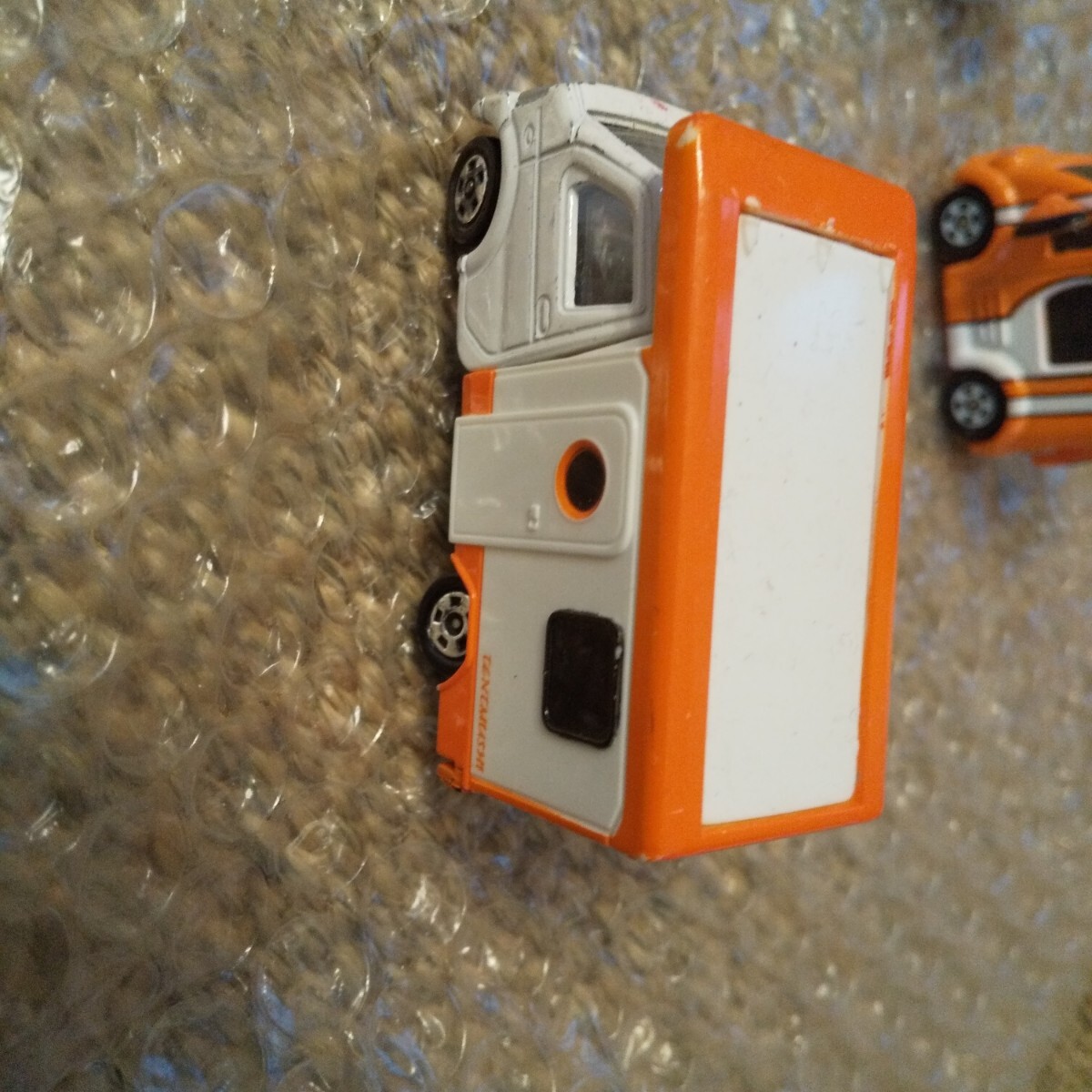白とオレンジのミニカーセット、バスと軽トラのデザイン。