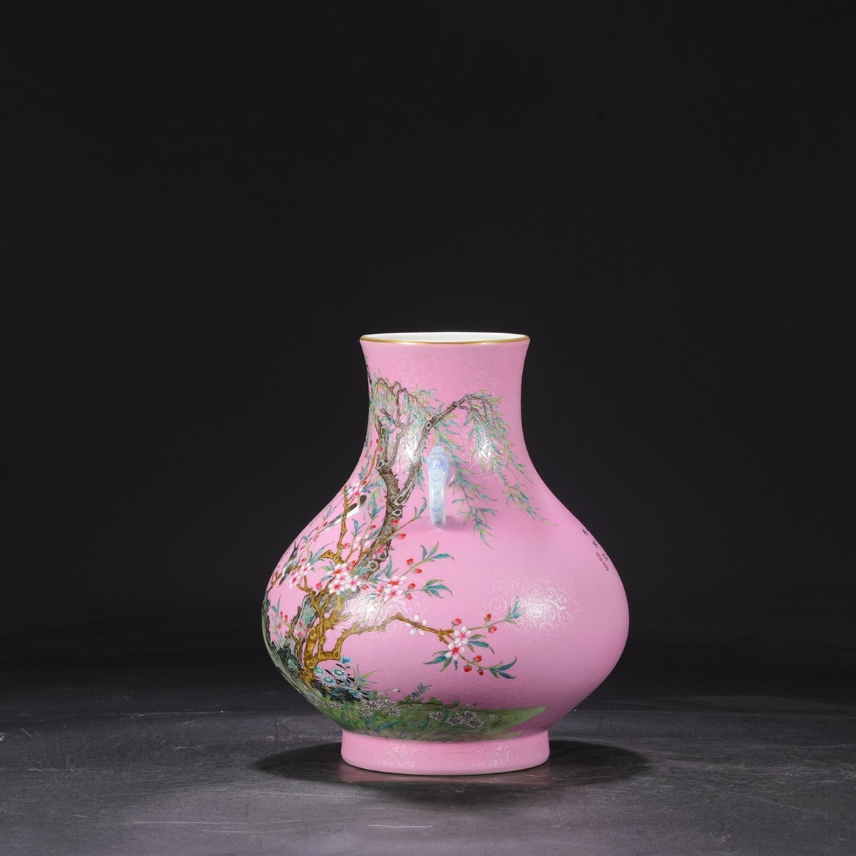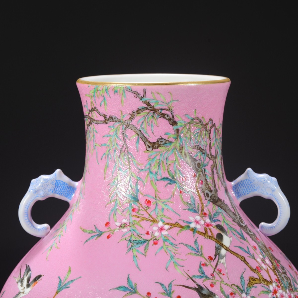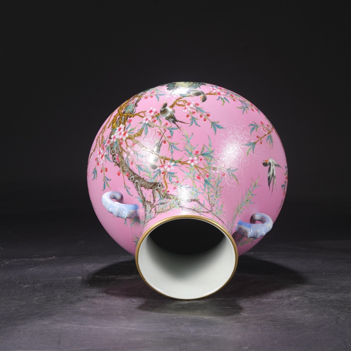 「清 雍正年製 陶磁器 粉地琺瑯彩花鳥紋 象耳尊瓶」染付 置物 擺件 古賞物 中国古美術 旧蔵出