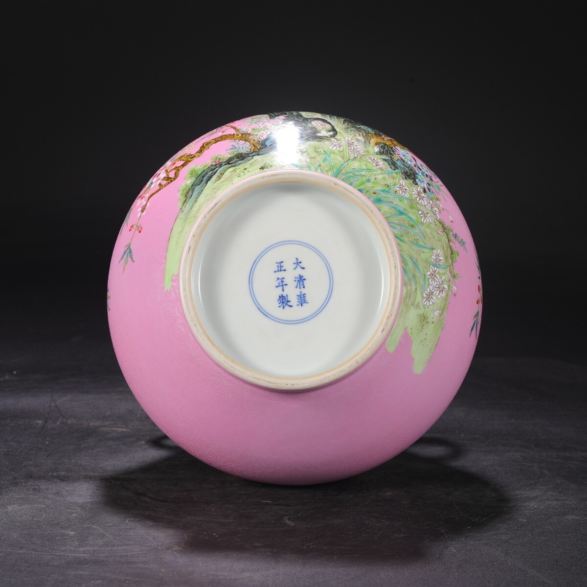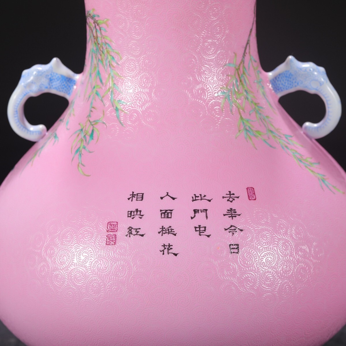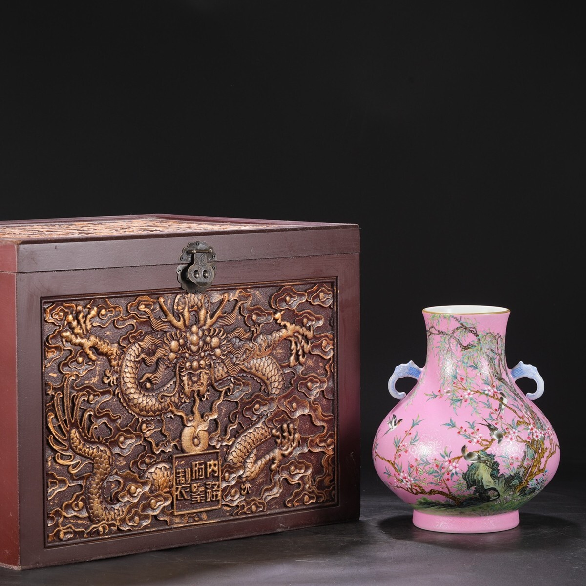 「清 雍正年製 陶磁器 粉地琺瑯彩花鳥紋 象耳尊瓶」染付 置物 擺件 古賞物 中国古美術 旧蔵出