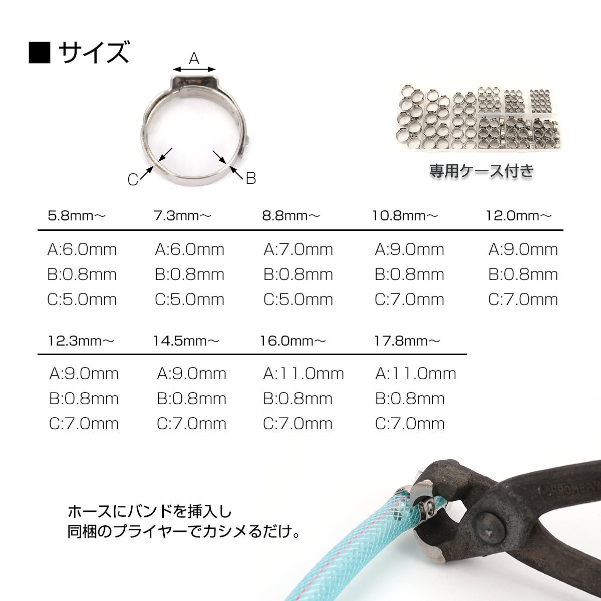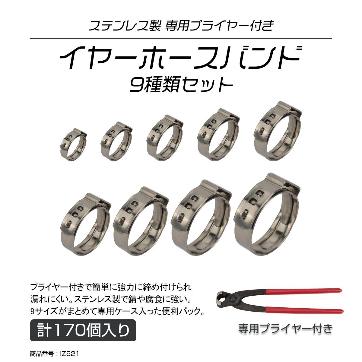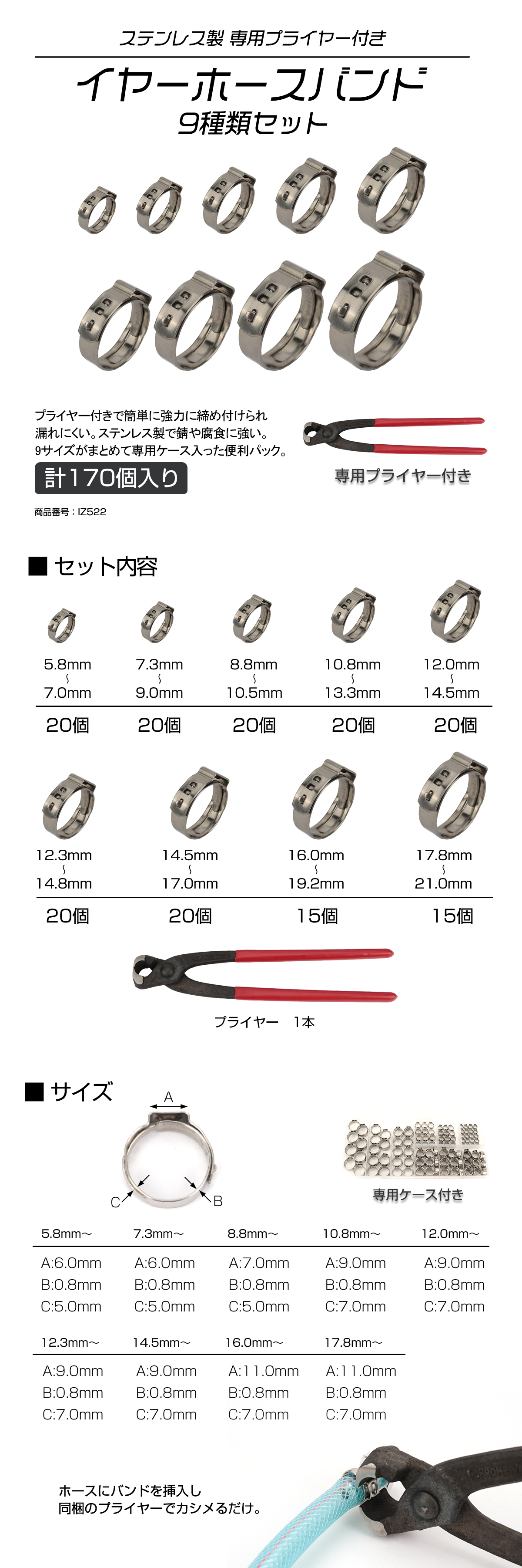 ■商品コード IZ522 ■商品タイトル イヤークランプ ステンレス製 9種類 170個 専用プライヤー付き ■数量 数量1で170個セット ■特徴 クランプ内周面に段差が出来ない構造で、360°段無しにホース材上へフィット。 漏れのない最適な密封性と真円さを保ちます。 スクリュー式バンドに比べ高さも低く、狭いスペースでも使用が可能。 別途工具を買い足す必要がない専用プライヤー付き。 9種類、合計170個のセット。 保管に便利なケース入り。 ■ セット内容 【 内径/個数 】 ・5.8?7.0mm/20個 ・7.3?9.0mm/20個 ・8.8?10.5mm/20個 ・10.8?13.3mm/20個 ・12.0?14.5mm/20個 ・12.3?14.8mm/20個 ・14.5?17.0mm/20個 ・16.0?19.2mm/15個 ・17.8?21.0mm/15個 ・専用プライヤー/1本 |