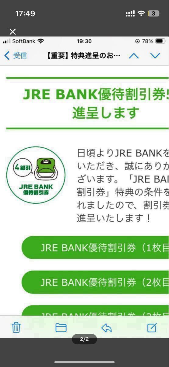 優待割引券番号とパスワードが記載されたJREBANK からの通知画面を送付します。