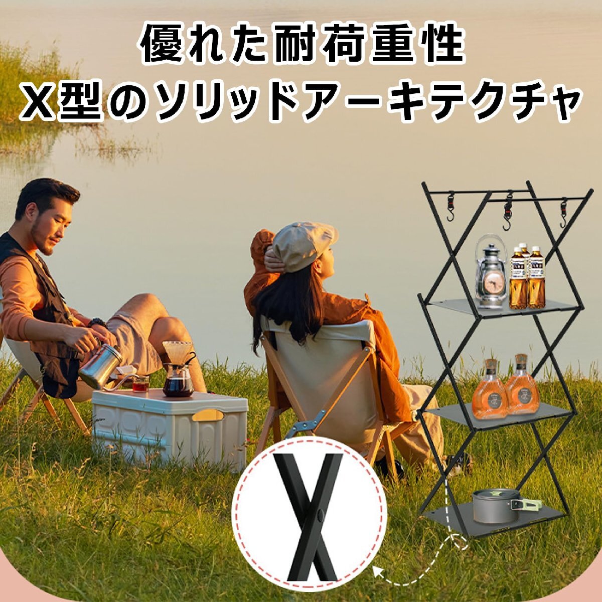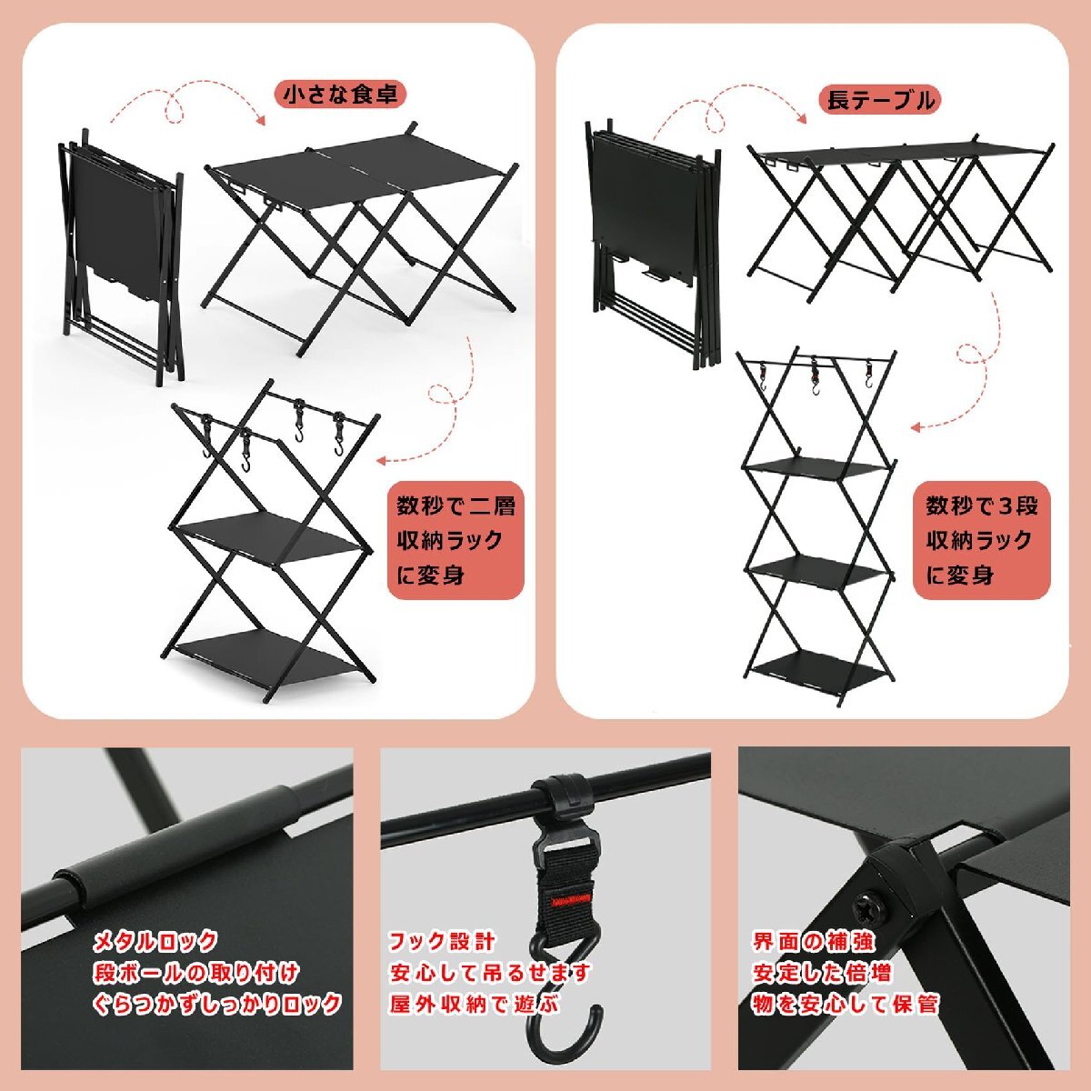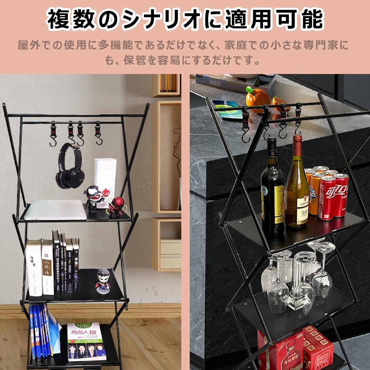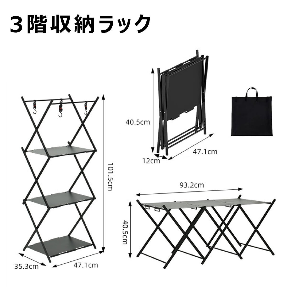 キャンプラック アウトドアテーブル フォールディングラック 3段物置き棚 シェルフ 折り畳みラック 2WAY アルミニウム 軽量 ハンガーフック