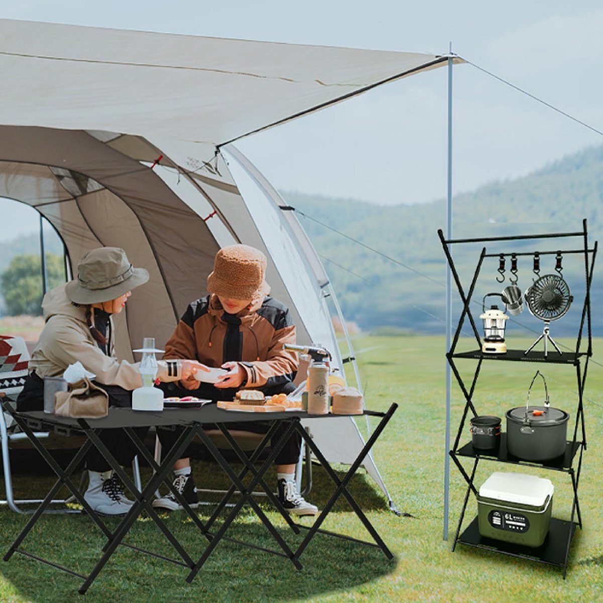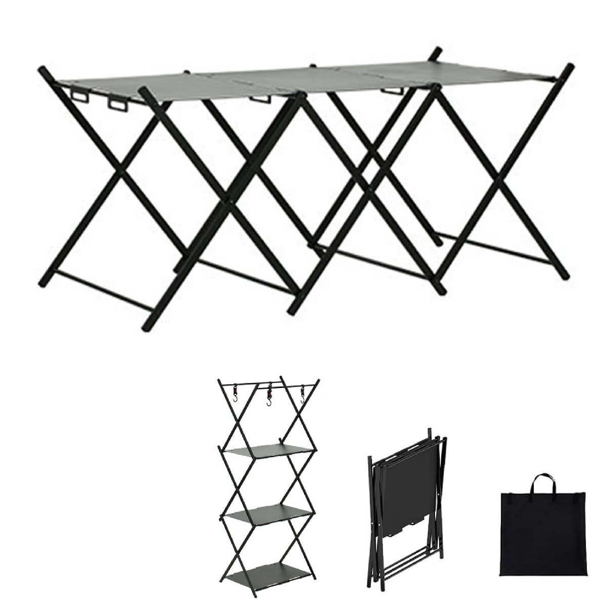 両用キャンプテーブル収納ラック:テーブルに展開したり、3層の収納ラックに組み立てたりすることができ、さまざまな飲み物、飲み物、食べ物、ランプなどを収納ラックに置いたり、クロスバーに掛けたりできます。層は支持力10KGにすることができます。