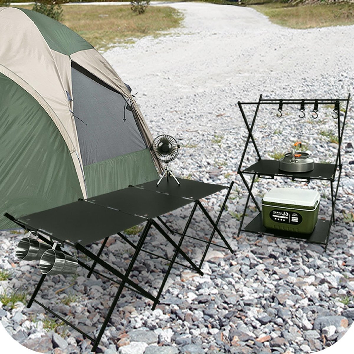 取り付けが簡単:ロールアップキャンプテーブルは一体型のデザインで、開くたびに、最初にフレームを展開し、必要に応じてパネルを回転させるだけで、テーブルや棚に簡単に変換できます。