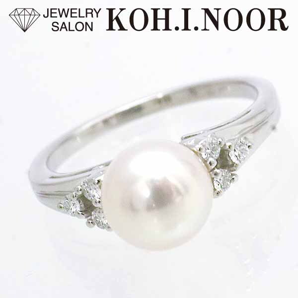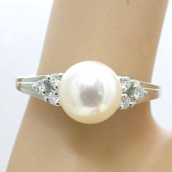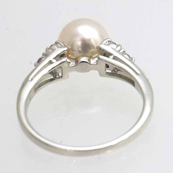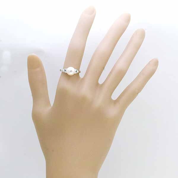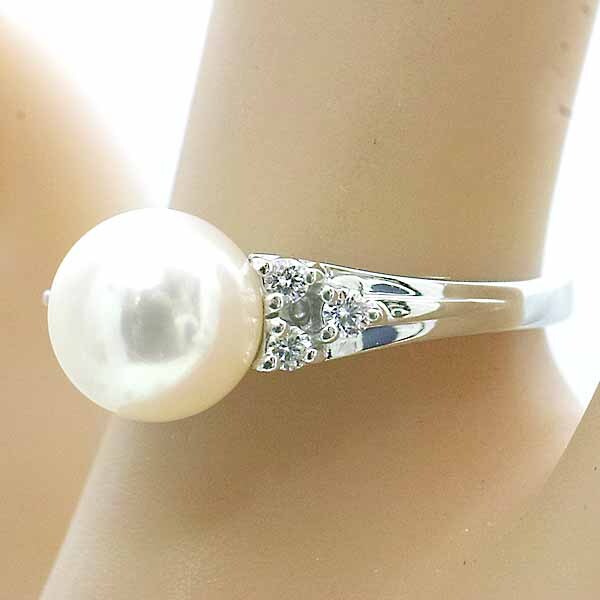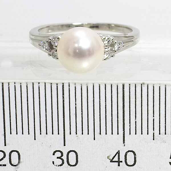 アコヤパールの両サイドに3石ずつのダイヤをセットしたミキモトのプラチナ製ファッションリング。