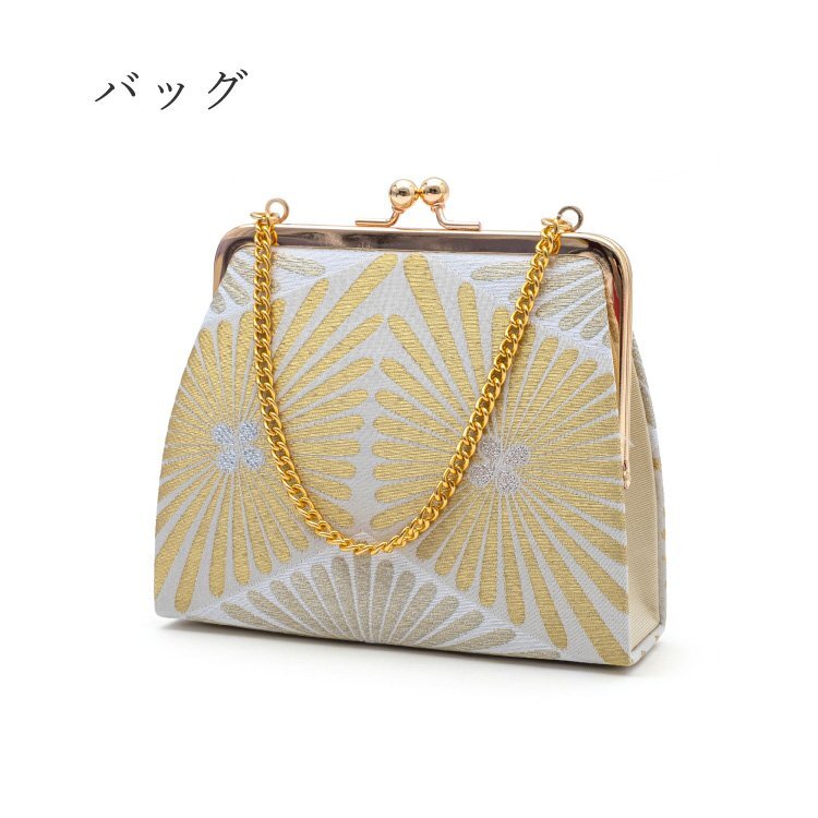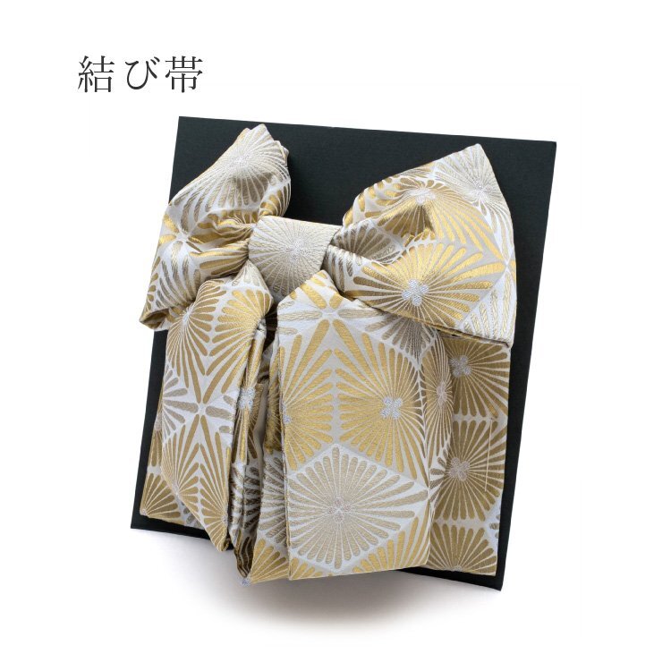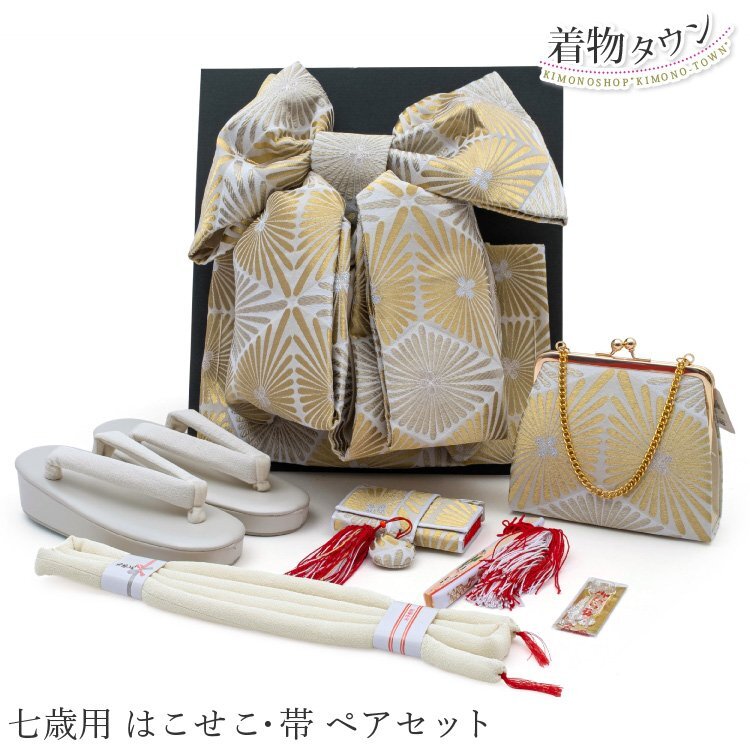 はこせこ・結び帯・草履バッグセットです。 必要な小物が揃う7点セットです。 子供様の着物姿を一層華やかにしてくれます。 ゴールドの地色に豪華な花柄が織られています。 |