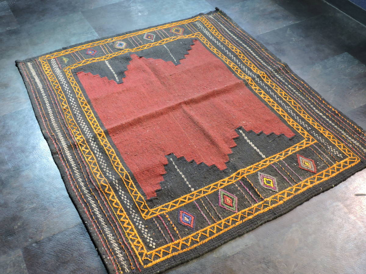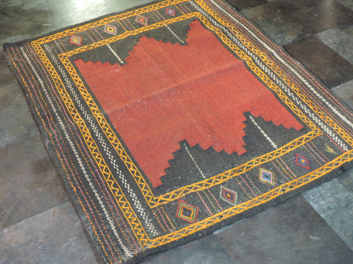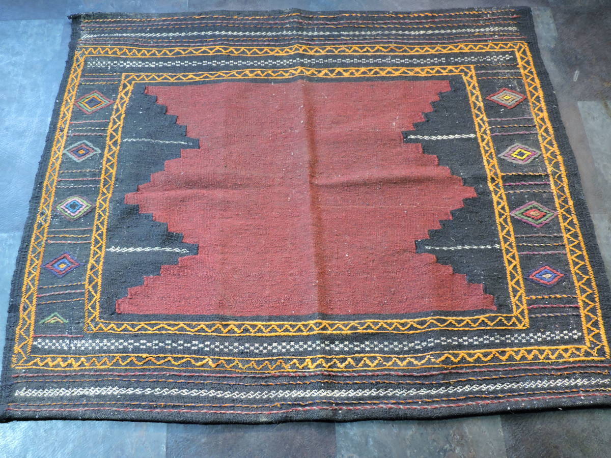 A064☆キリム 手織り ウール ラグ 絨毯 アンティーク 一点物 タペストリー サイズ約118x101  黒ベースラグ☆