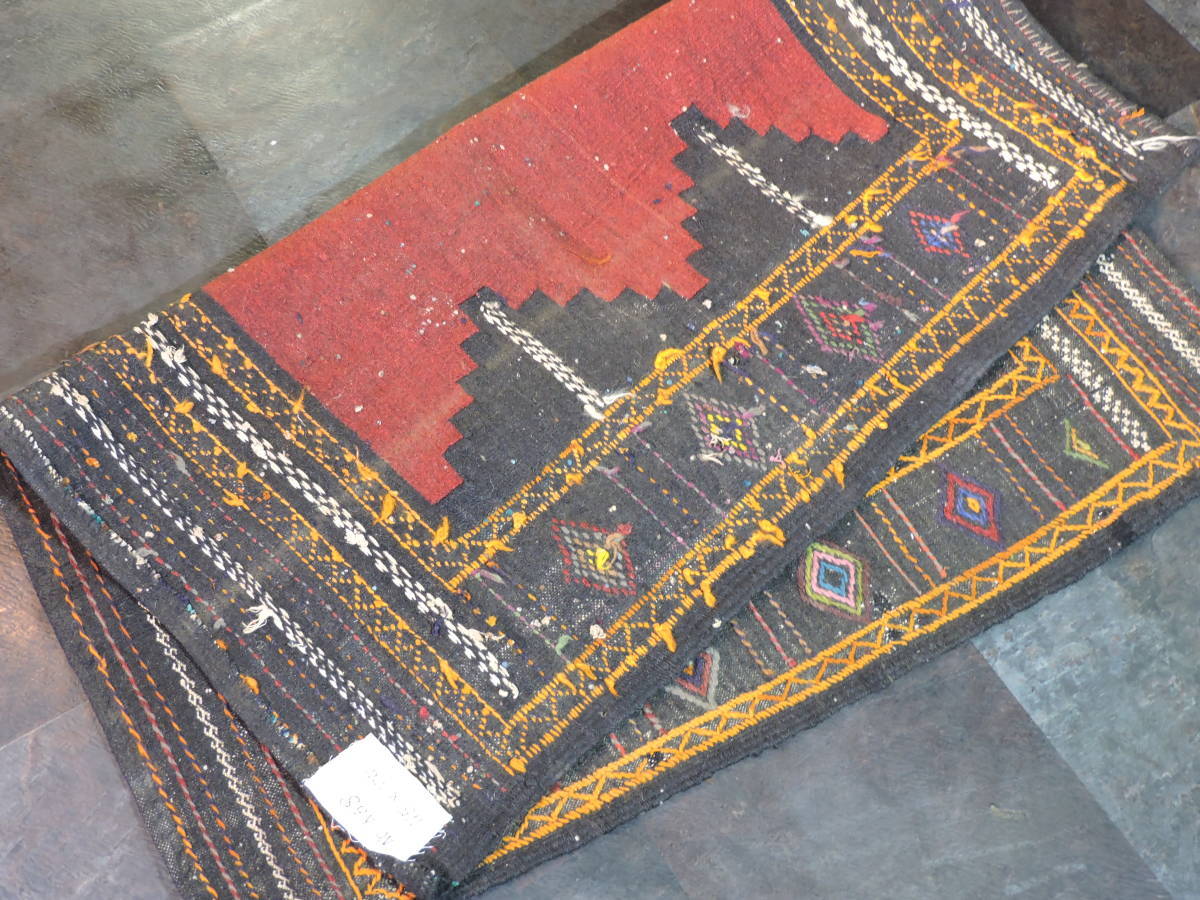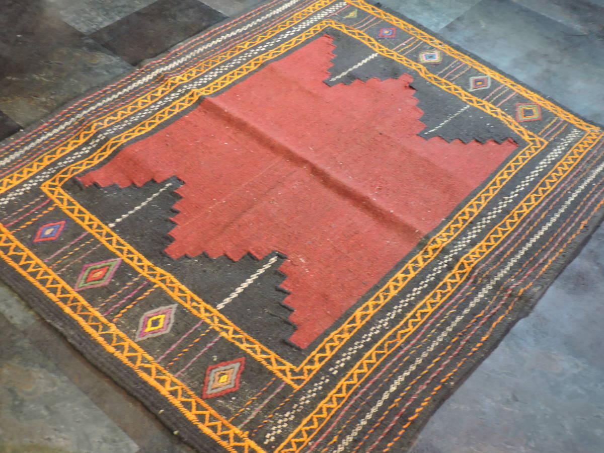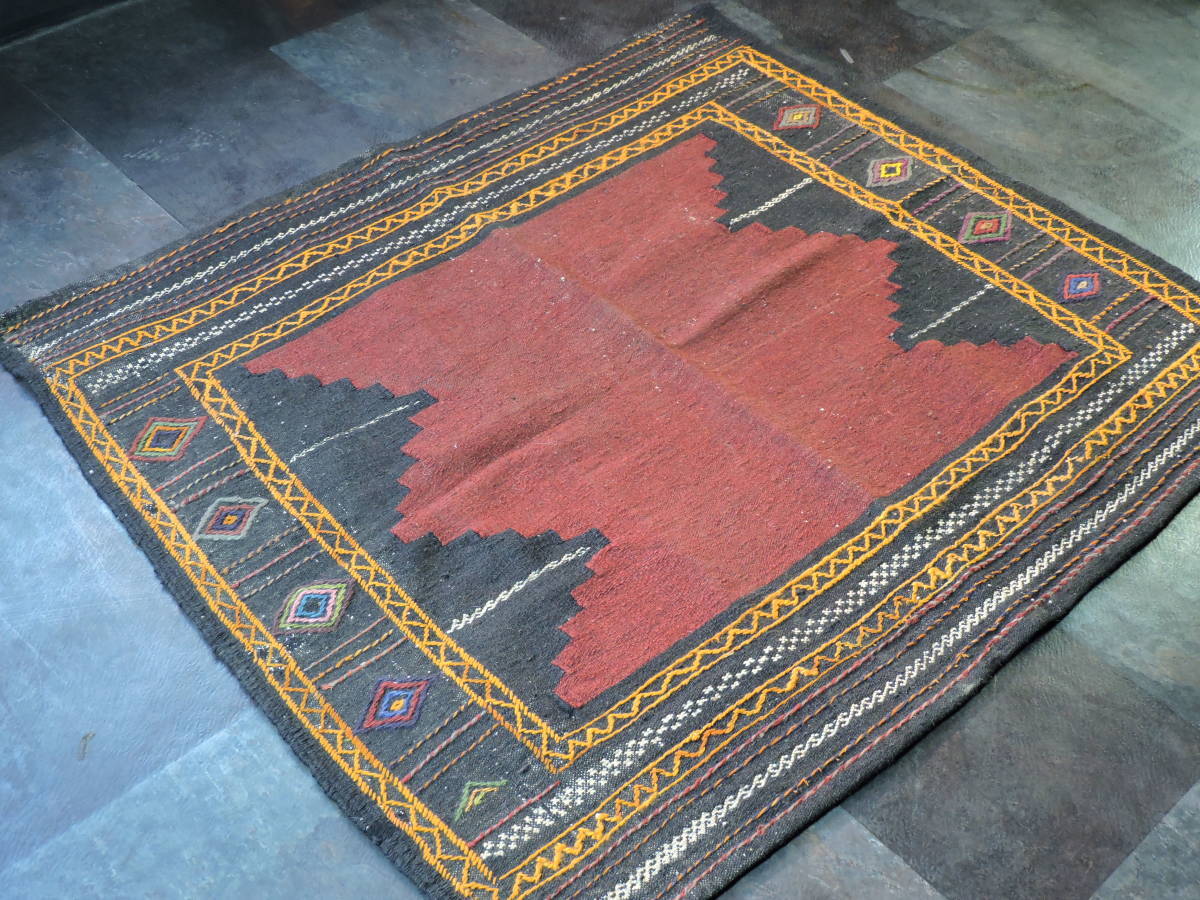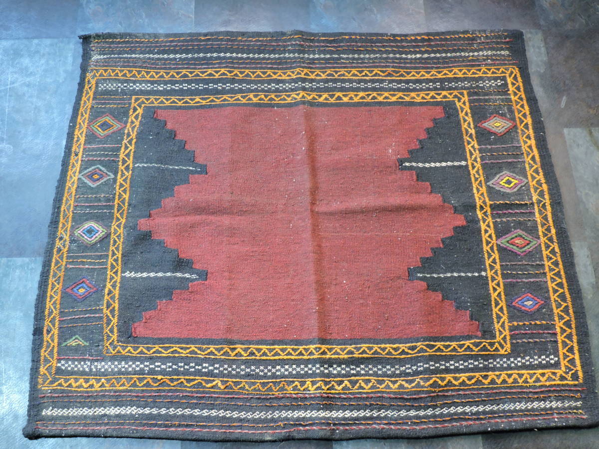A064☆キリム 手織り ウール ラグ 絨毯 アンティーク 一点物 タペストリー サイズ約118x101  黒ベースラグ☆