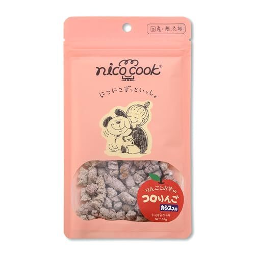 「nico cook コロりんご カシス 犬 ペット おやつ 国産 りんご さつまいも 無添加 無着色 ニコクック」▼4979142215091▼(商品説明)ピンク/50g/-・FlavorName:コロりんご カシスSize:50g・パッケージ個数:1・本品は着色料、香料、甘味料、保存料等の添加物を使用しておりません。そのため、原料の収穫時期や、商品の製造時期によって、色合いや硬さや甘みが変わる場合があります。本品の表面に白く見える部分がありますが、原材料の皮や果肉になりますので、品質には問題ございません。・注意おなかが緩くなる可能性があるので、生後6か月未満の幼犬には与えないでください。・1日の給餌量目安超小型:30g以内、小型:40g以内、中型:60g以内、大型:100g以内を目安に体調や運動量により量を調整して与えてください。・成分値粗たんぱく質:8%以上、粗脂肪:1%以上、粗繊維:3%以下、粗灰分:3%以下、水分:15%以下、エネルギー:154kcal/100g