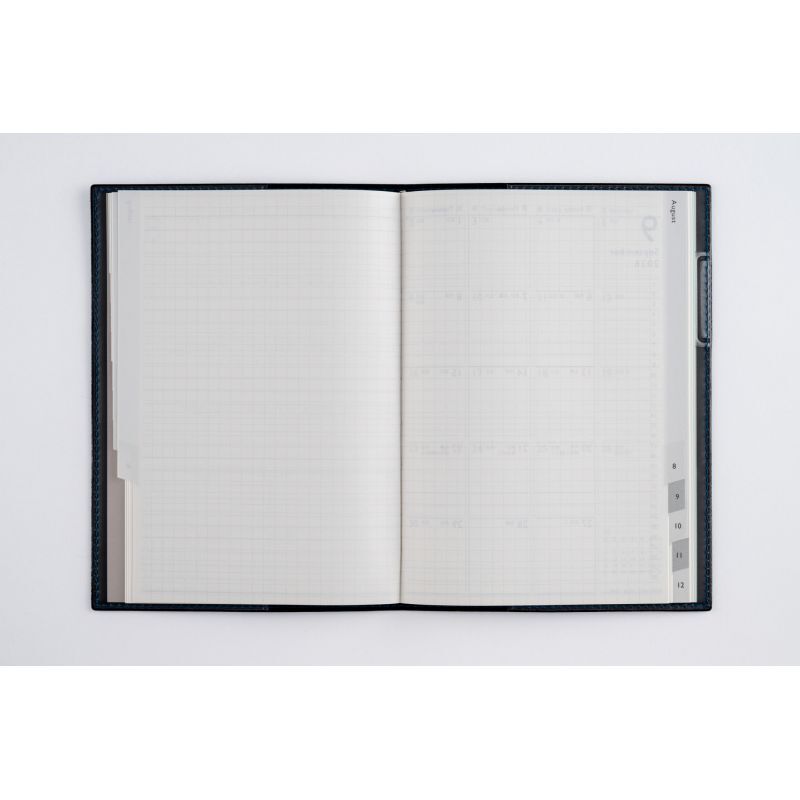 【月間予定表】使いやすいブロック式はインデックス付きで便利。月ごとに横ケイメモと方眼メモが2ページずつ付いているので、月間ページに書ききれなくても安心です。