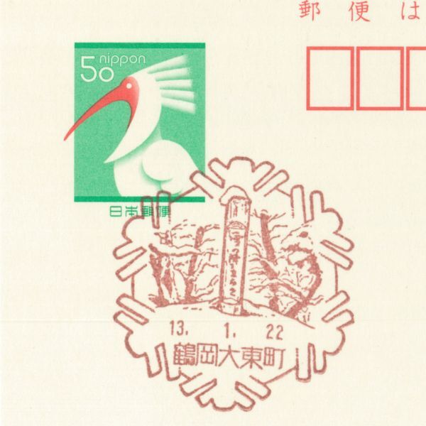 風景印☆初日☆山形・鶴岡大東町・H13.1.22・雪の結晶の枠