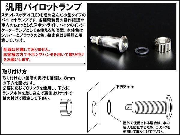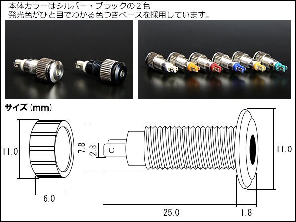 汎用 11mm LED パイロットランプ 24V用 本体ブラック 各種電装品の動作確認や車内のちょっとしたスポットライト、バイクのインジ ケーターランプとしても使える防滴型。 本体色はシルバーとブラックの2色、発光色は6種類ご用意しています。 ※出品は本体色ブラック、発光色はタイトルのカラーです。 配線は付属しておりません。ギボシやハンダを用いて取り付けをお願いします。 12V用も販売中!他のモデルは⇒ こちら その他、DIY用品は⇒ こちら |