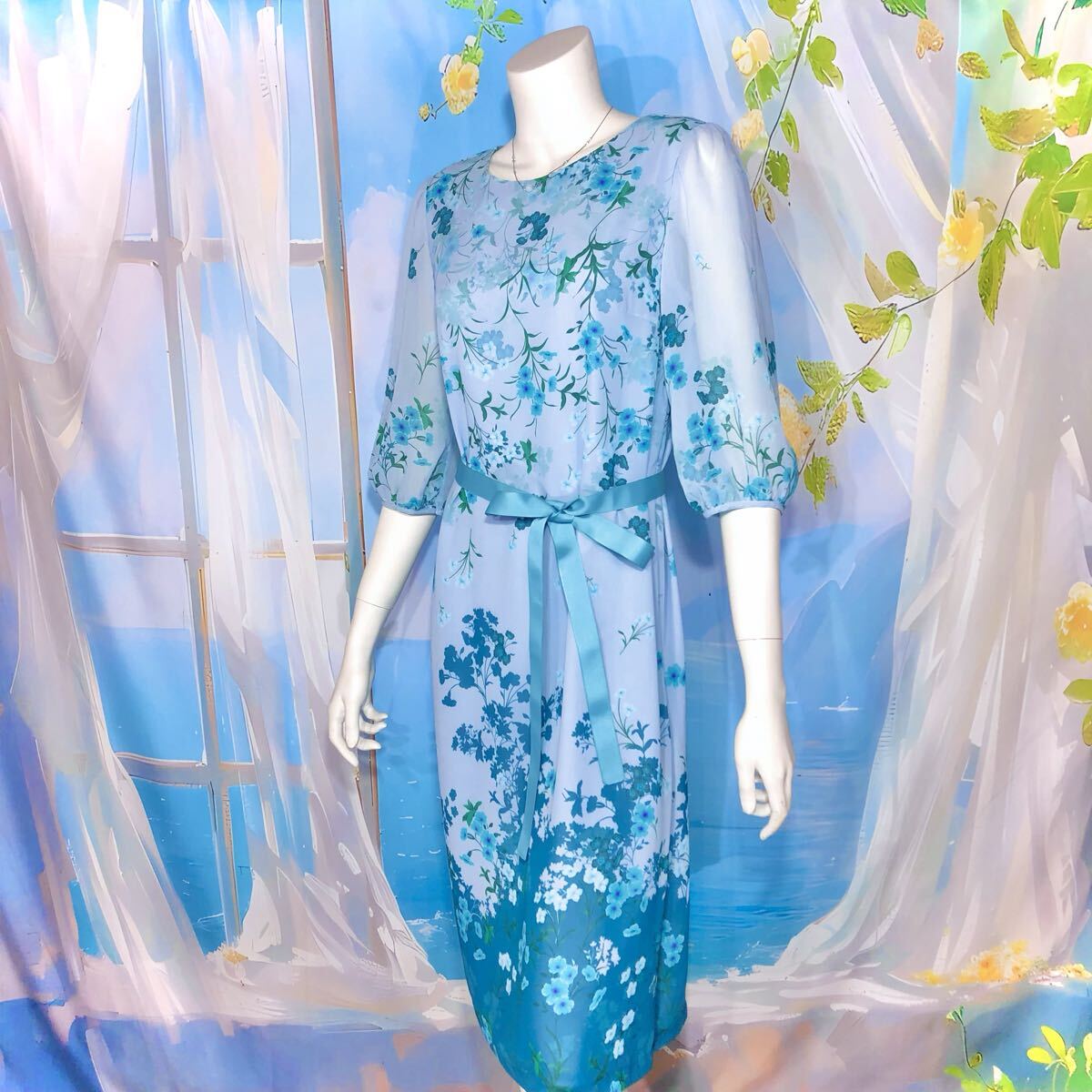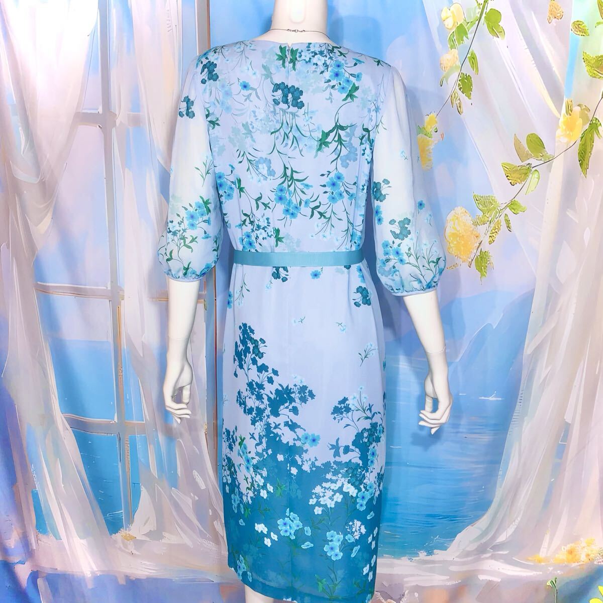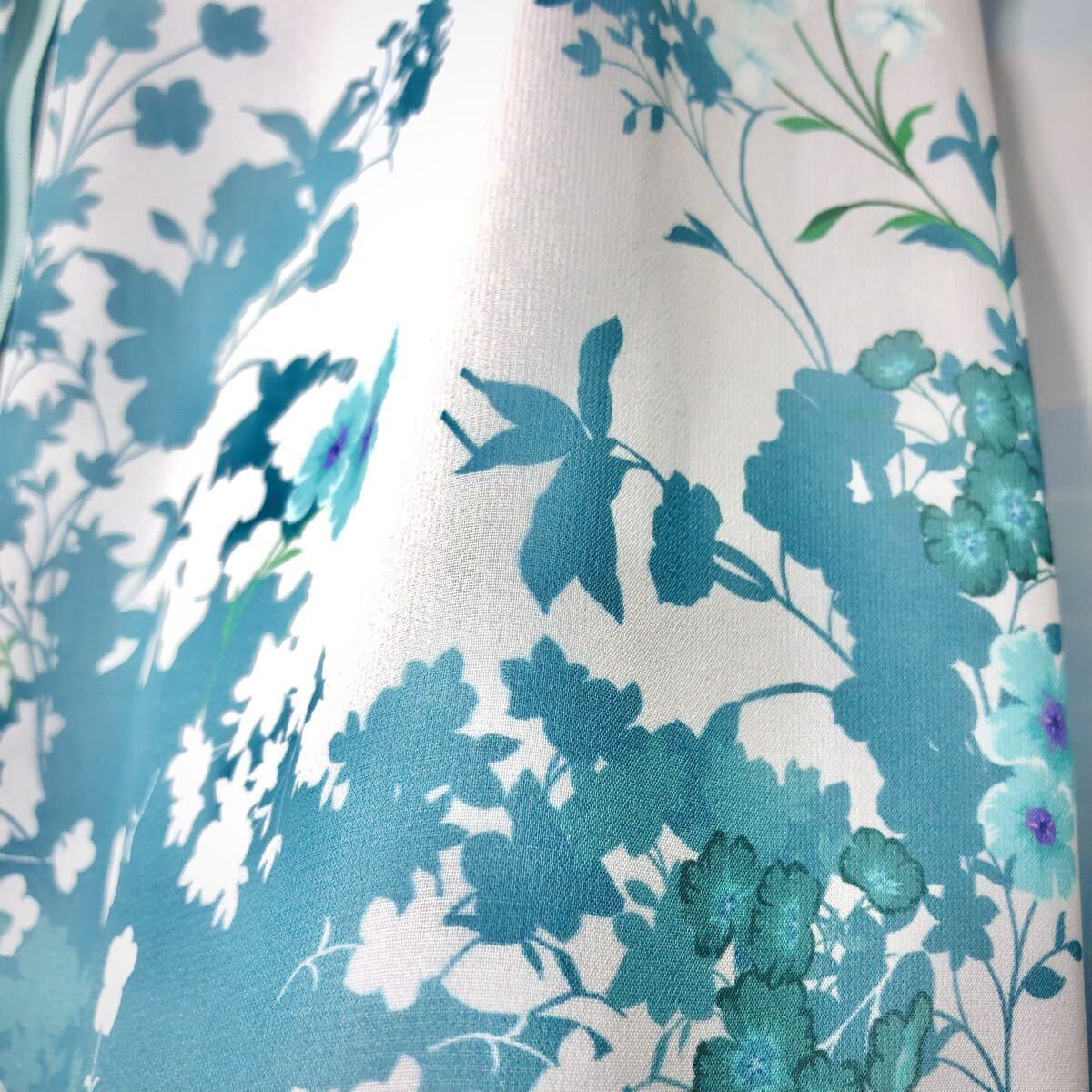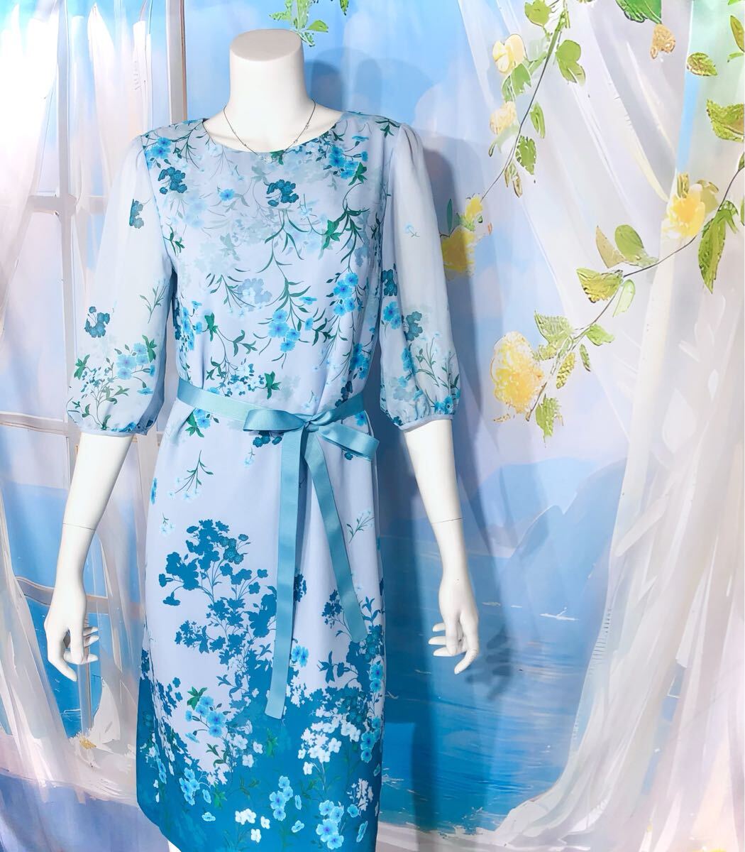 ソフトブルーエメラルドブルーフローラルワンピース フローラル シアー パネル柄ドレスワンピース オケージョン パーティ ブルーグリーン ペールブルー エメラルドブルー