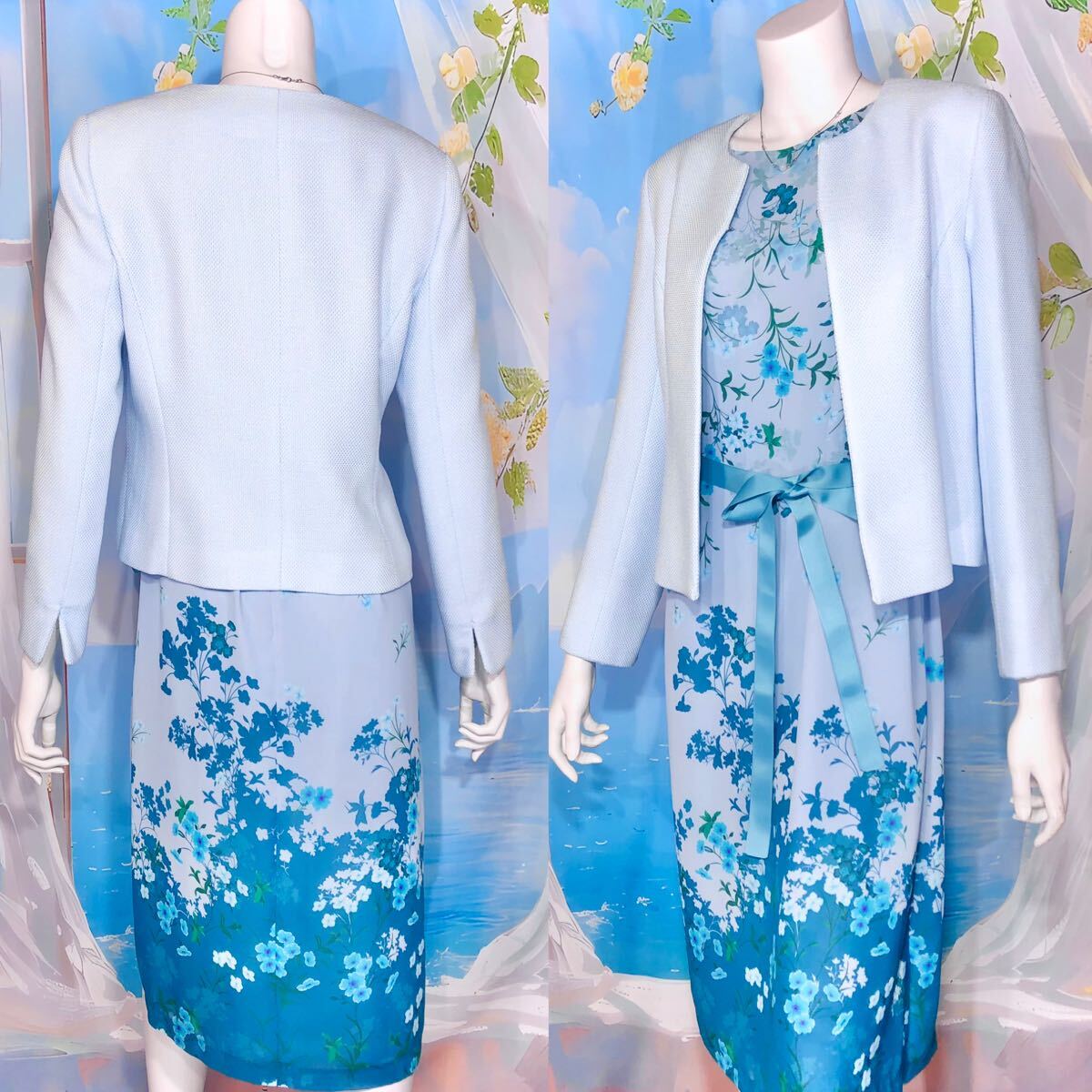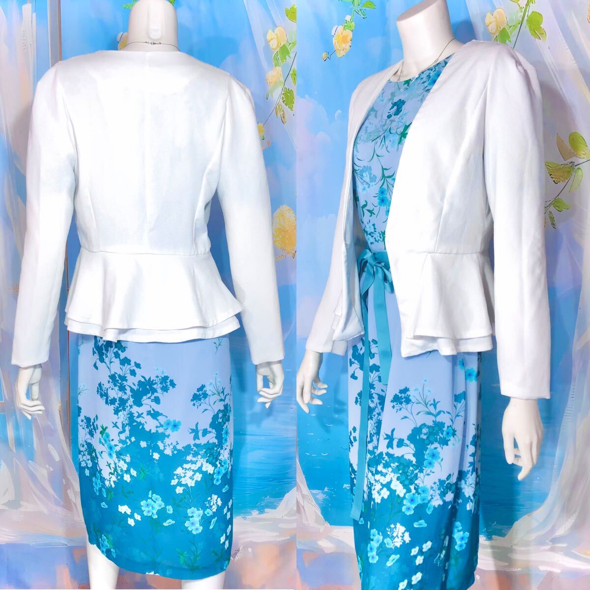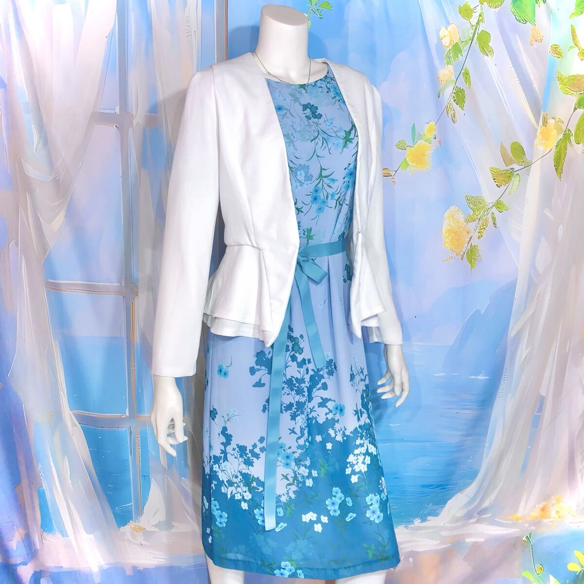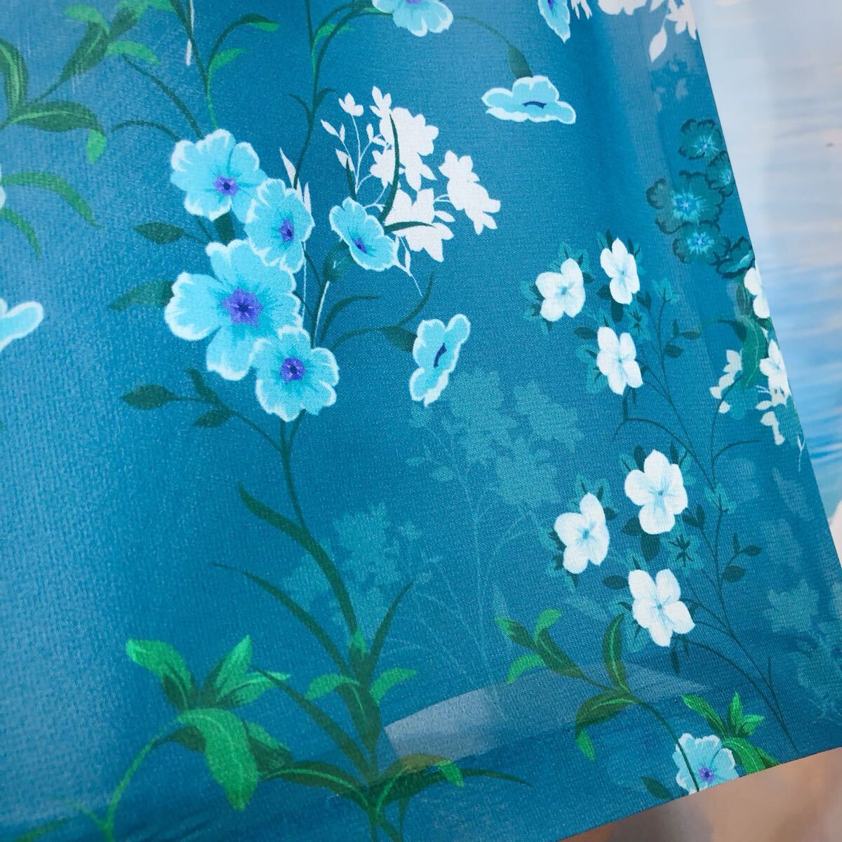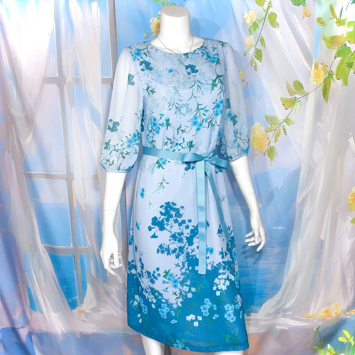 ソフトブルーエメラルドブルーフローラルワンピース フローラル シアー パネル柄ドレスワンピース オケージョン パーティ ブルーグリーン ペールブルー エメラルドブルー
