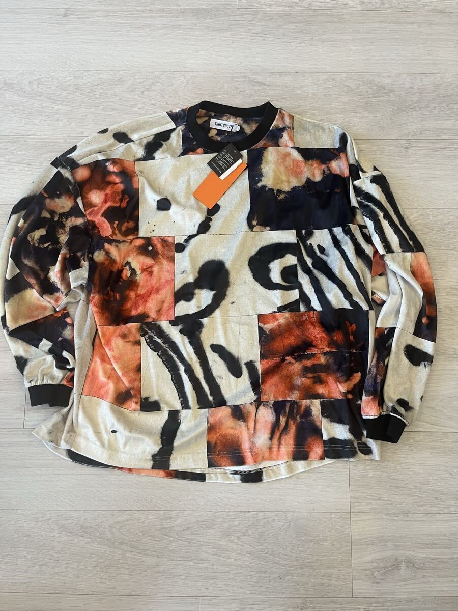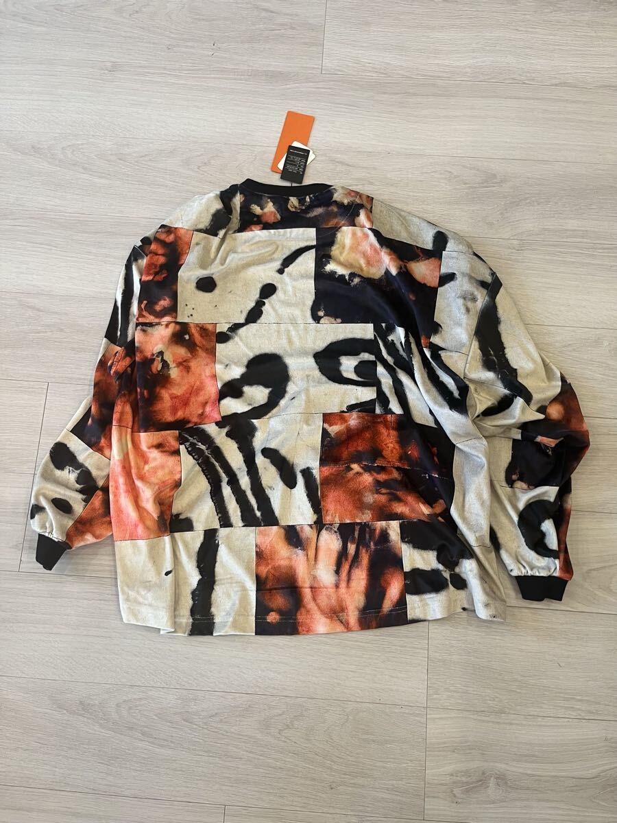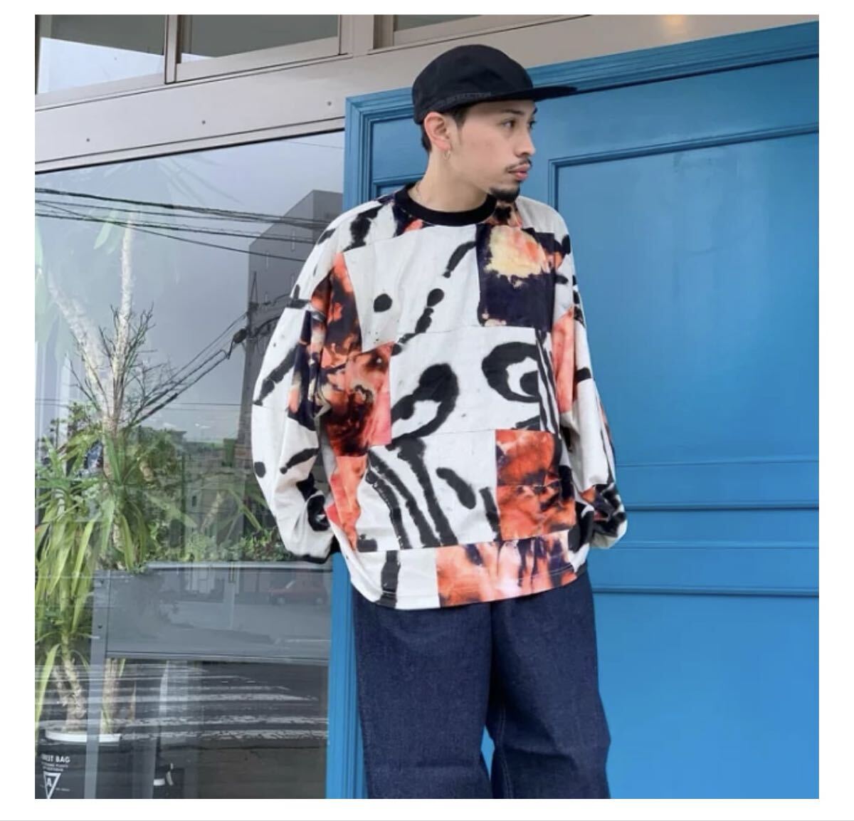 パッチワークデザインの長袖ウェア、ストリートスタイルに最適。