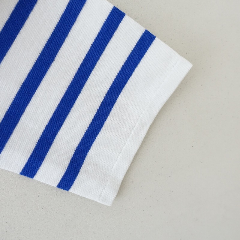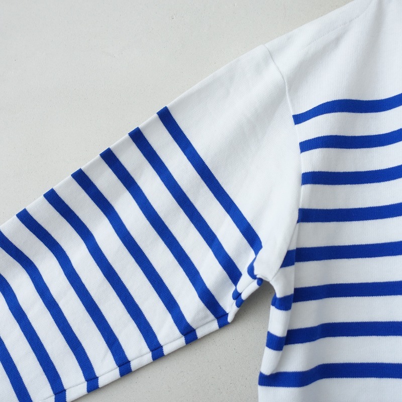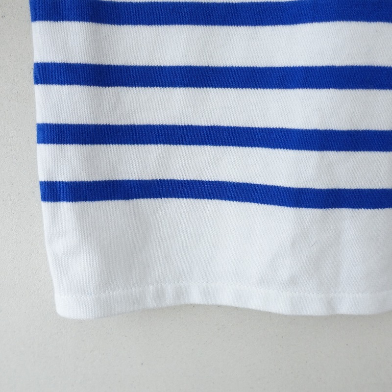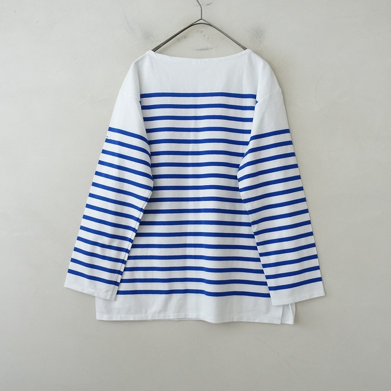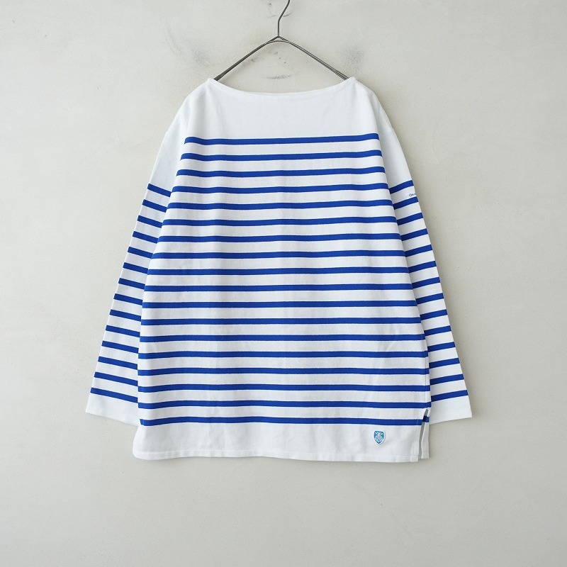ORCIVALのボーダーカットソーです。カラーはホワイト×ブルー、プルオーバータイプで、フロント左裾にブランドワッペン・裾両サイドにスリットが施されております。 |