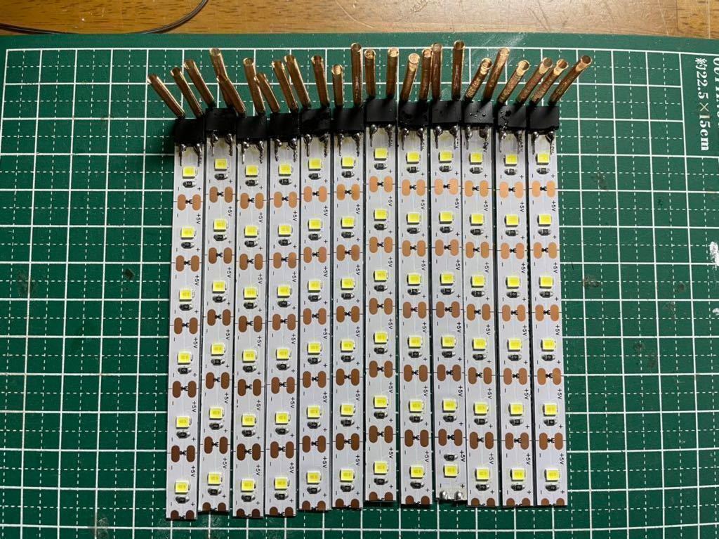 注意事項 :既存のテープLED室内灯を変更、改良し当方の所有車両で動作不良もないことから当オークション向けに製作し出品します。前回品同様に強度を確保するためテープLEDにプラ板を貼り付け3M製強力両面テープを使用していますのでしっかり取り付けられます。1本1本手作りのため数量限定です。なお、点灯確認後出品しておりますが、素人製作のため細かい部分(ハンダ付けなど)はご容赦ください。1本あたりの長さはダイオード(黒色のもの)を含めて約10.8cmです。また1本あたりの消費電力は0.48wです。製品は1本あたり6個のLEDですが、取り付け車両に応じてカット可能となっています。6個LEDは中間車両、5個LEDは先頭車両と使い分けが可能です。長時間点灯(30分以上連続点灯)すると、人肌程度の熱を持つ場合があります。模型自体に影響はありませんがご注意ください。