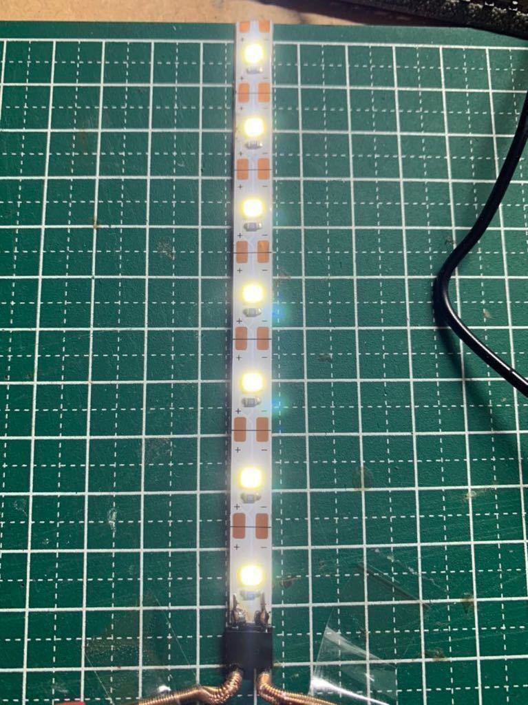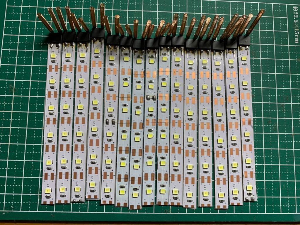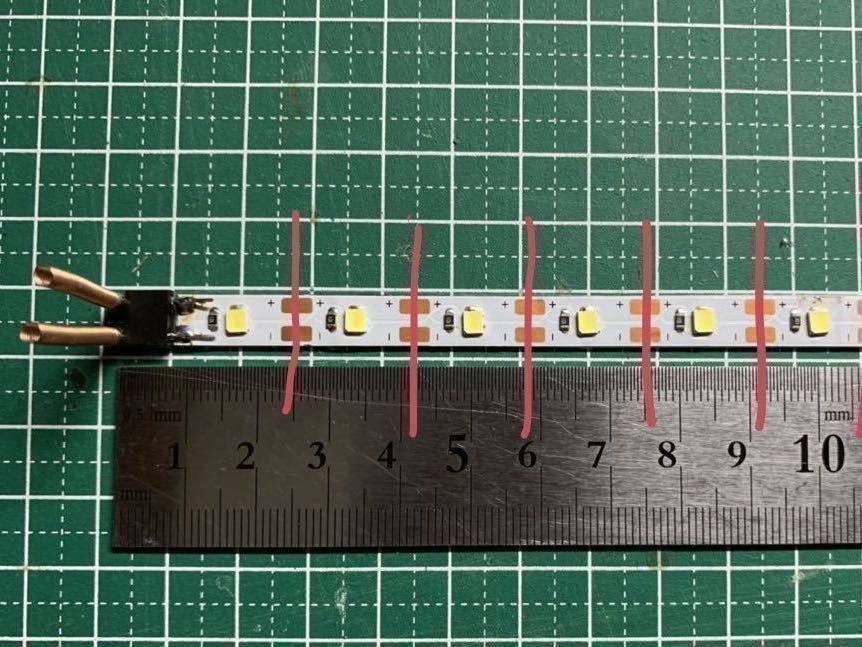 注意事項 :既存のテープLED室内灯を変更、改良し当方の所有車両で動作不良もないことから当オークション向けに製作し出品します。前回品同様に強度を確保するためテープLEDにプラ板を貼り付け3M製強力両面テープを使用していますのでしっかり取り付けられます。1本1本手作りのため数量限定です。なお、点灯確認後出品しておりますが、素人製作のため細かい部分(ハンダ付けなど)はご容赦ください。1本あたりの長さはダイオード(黒色のもの)を含めて約10.8cmです。また1本あたりの消費電力は0.48wです。製品は1本あたり6個のLEDですが、取り付け車両に応じてカット可能となっています。6個LEDは中間車両、5個LEDは先頭車両と使い分けが可能です。長時間点灯(30分以上連続点灯)すると、人肌程度の熱を持つ場合があります。模型自体に影響はありませんがご注意ください。