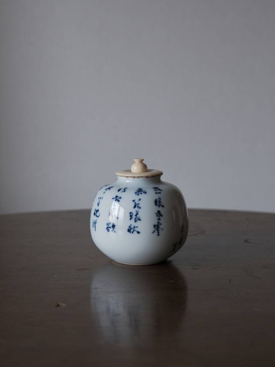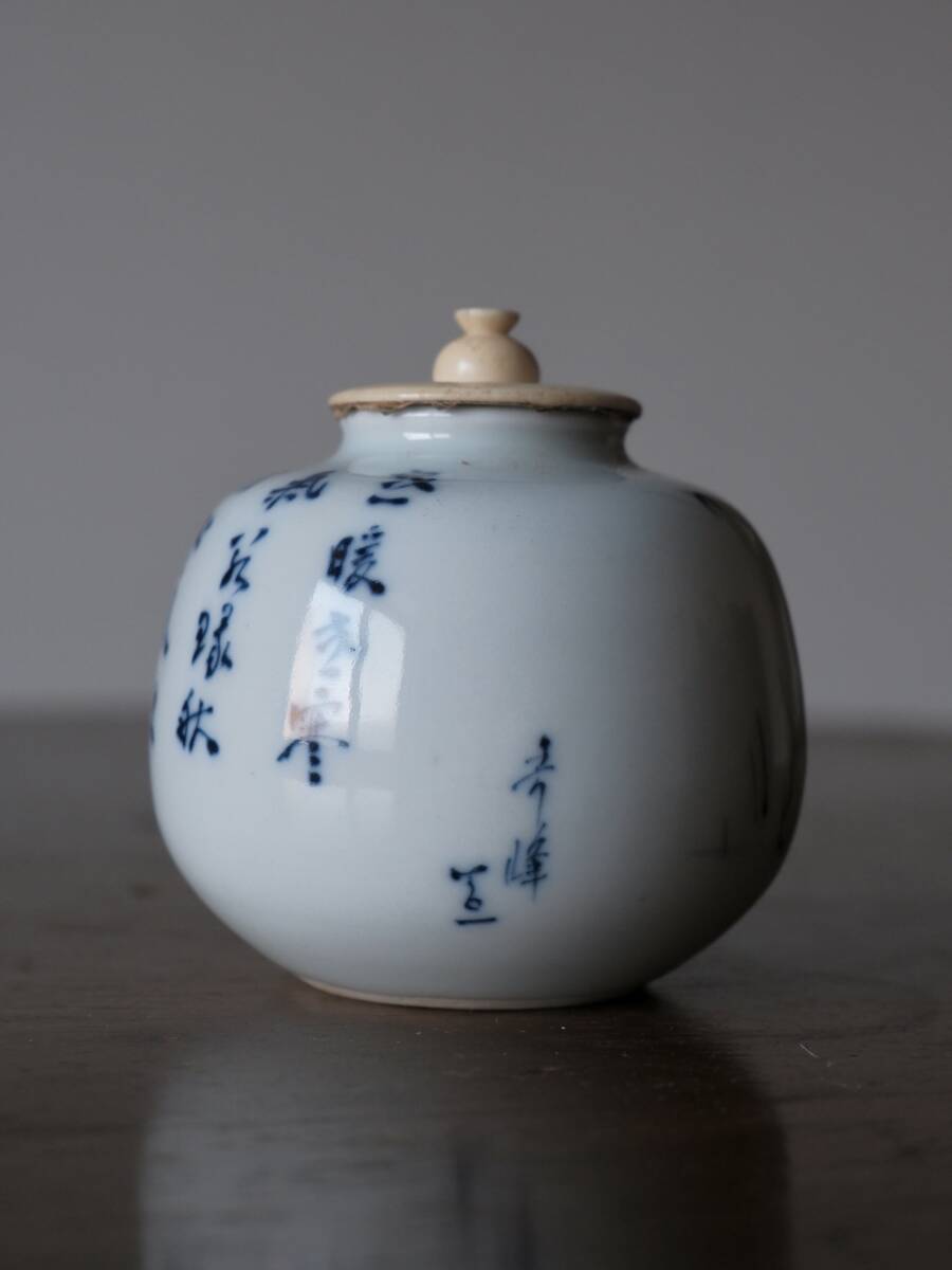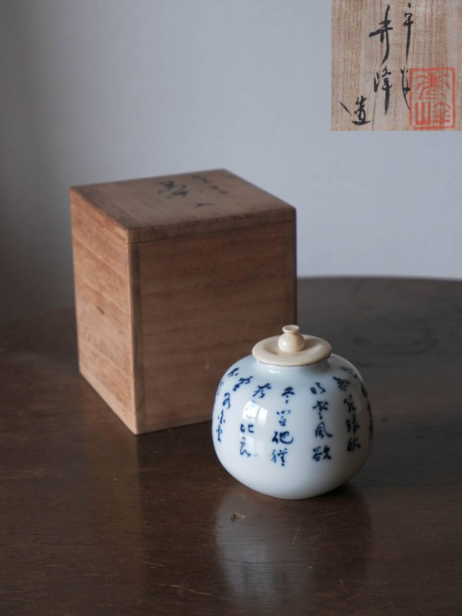 【青枠】平安春峰 染付漢詩文 茶入れ 茶道具 箱付 陶磁工芸 古道具 時代物 美術品Q1890