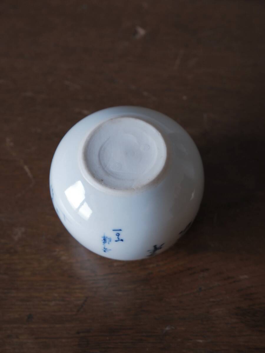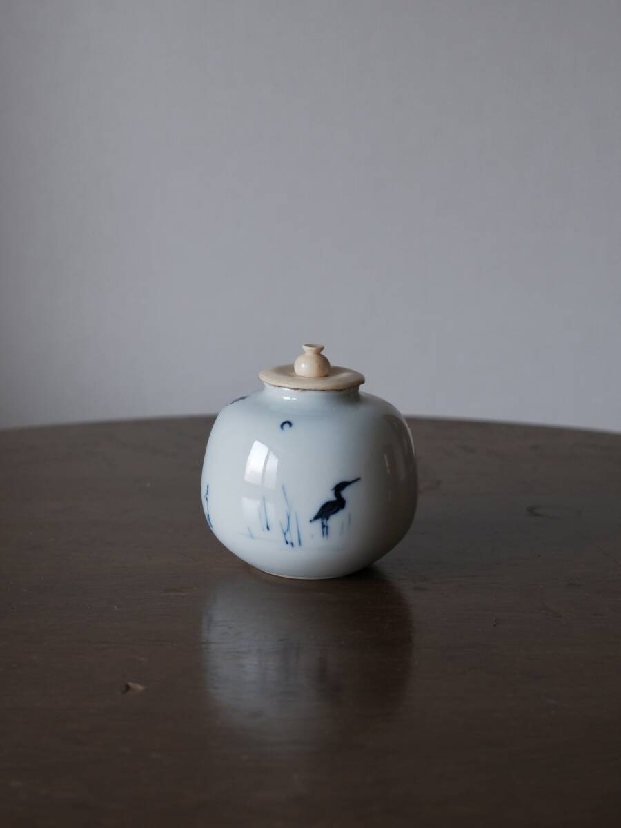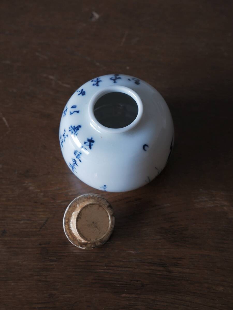 【青枠】平安春峰 染付漢詩文 茶入れ 茶道具 箱付 陶磁工芸 古道具 時代物 美術品Q1890